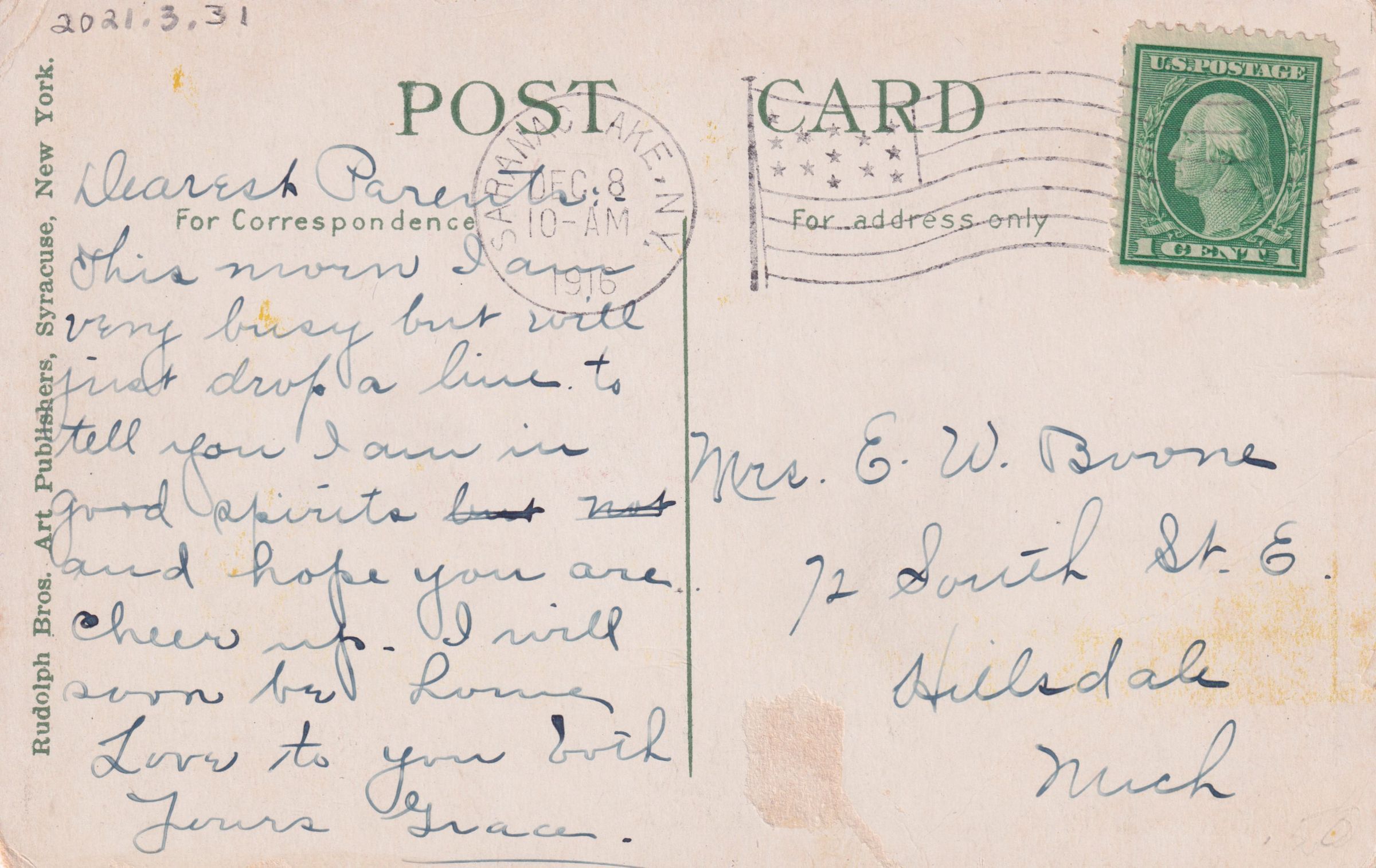 Color postcard showing the Administration/Main Building [later Dodd Hall] at Trudeau Sanatorium. Used, divided back, white border, postmarked December 8, 1916, Saranac Lake, NY. Printed by Rudolph Bros. Art Publishers, Syracuse, NY. Caption printed on front reads, "Administration Bldg., Trudeau Sanitarium [sic], Saranac Lake, N.Y." Handwritten message on the back reads, "Dearest parents, this morn I am very busy but will just drop a line to tell you I am in good spirits and hope you are. Cheer up. I will soon be home. Love to you both, Yours Grace." Mailed to Mrs. E. W. Boone, 72 South St. E., Hillsdale, Mich.Subject Place