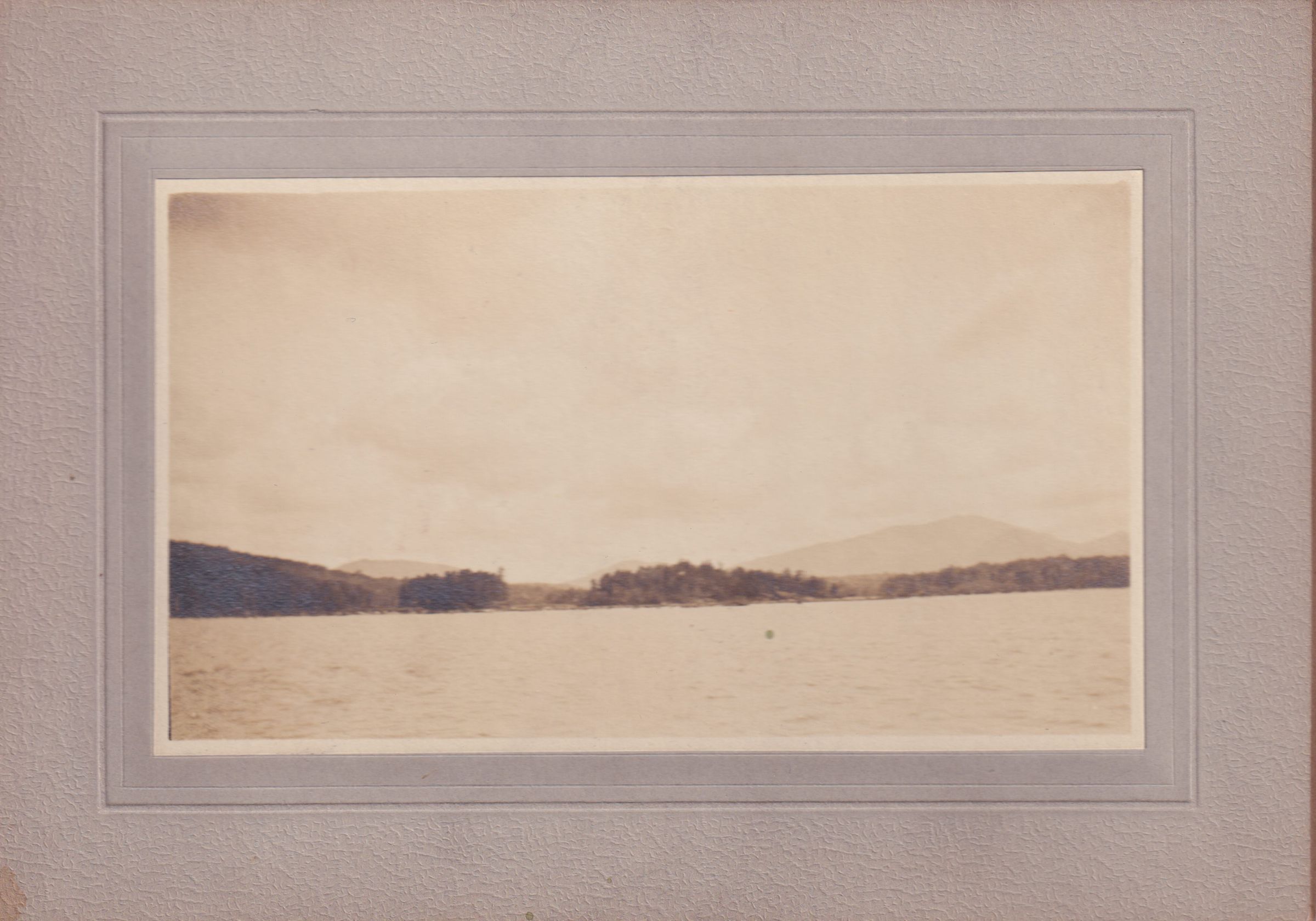 Photograph of an unidentified lake with land in the distance. A possible bridge can be seen connecting across the water. Mounted on gray cardboard.