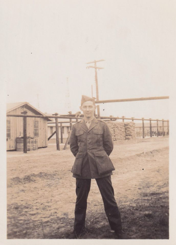 Black-and-White photograph of an unidentified soldier. He is standing in front of a large fenced-in area. The photograph was likely printed by Kollecker's Kodak and Gift Shop.