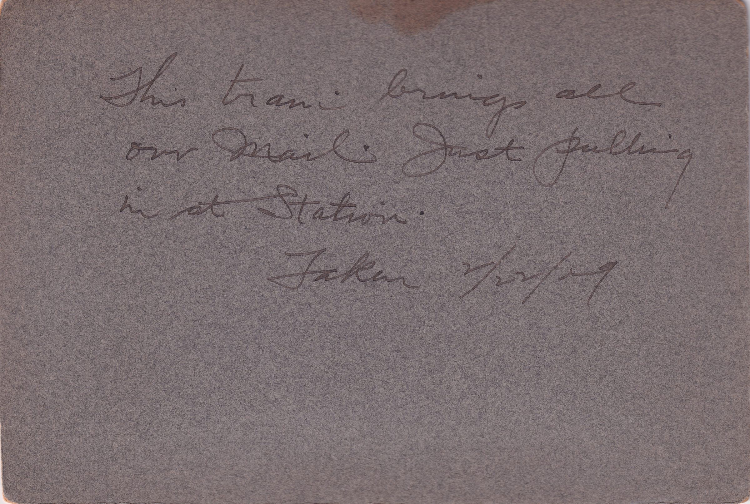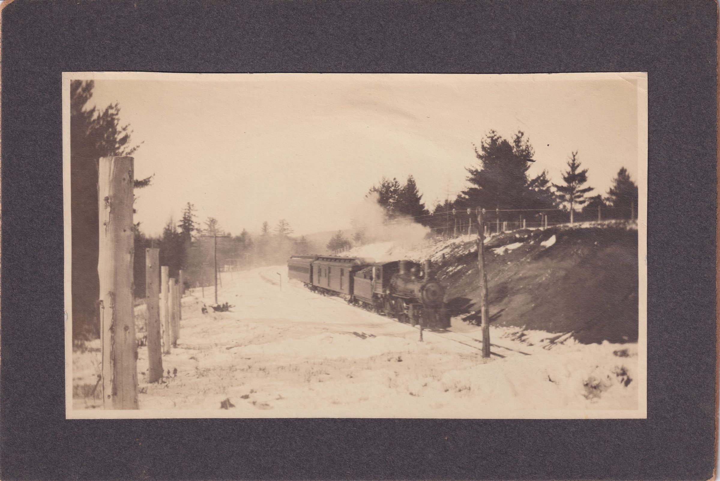 Photograph of a train coming down the tracks through a snowy landscape. Mounted on cardboard. Caption on reverse reads, "This train brings all our mail. Just pulling in at station. Taken 2/22/09." Caption on reverse of duplicate photo reads, "Train pulling into station. Your affinity is still on the job. 2/22/09."Photograph Details