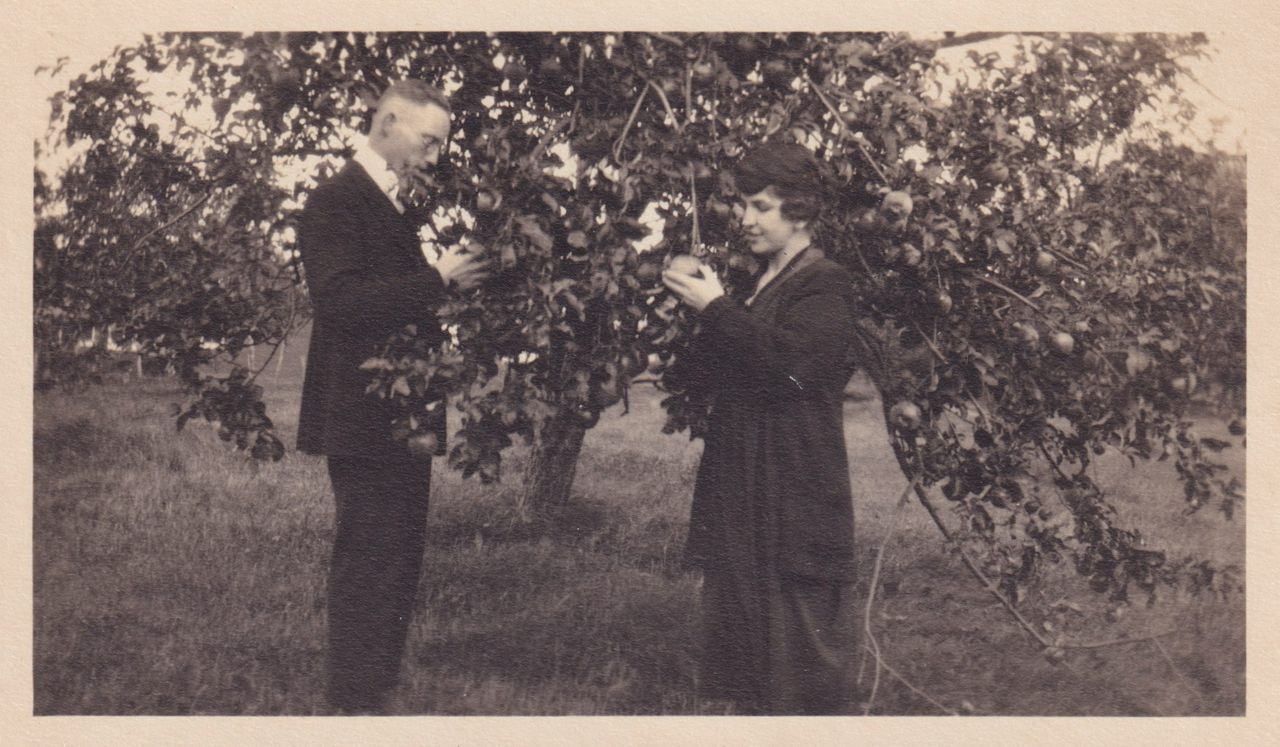 Black-and-White photograph of an unidentified man and a woman standing under an apple tree. The photograph was likely printed by Kollecker's Kodak and Gift Shop.