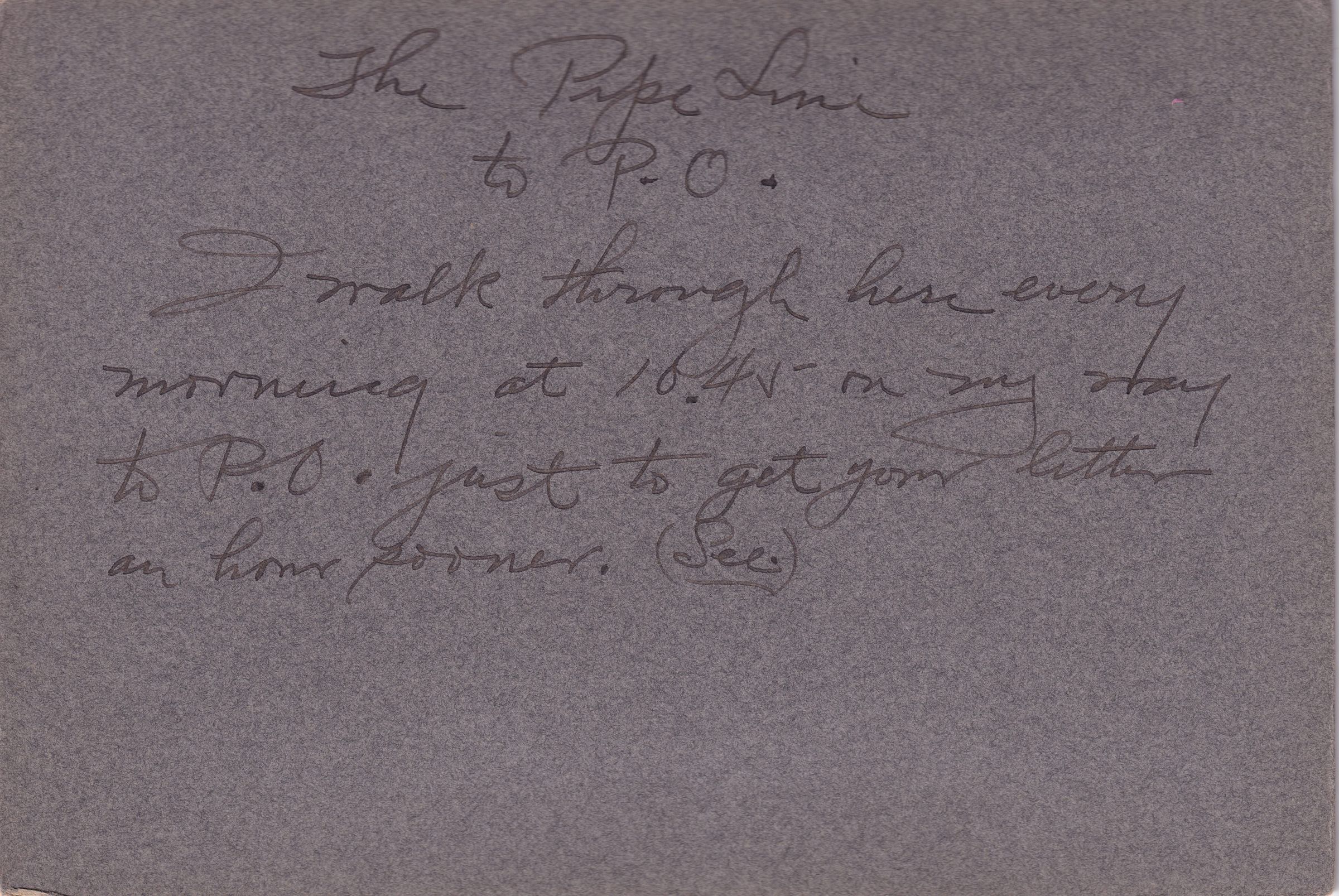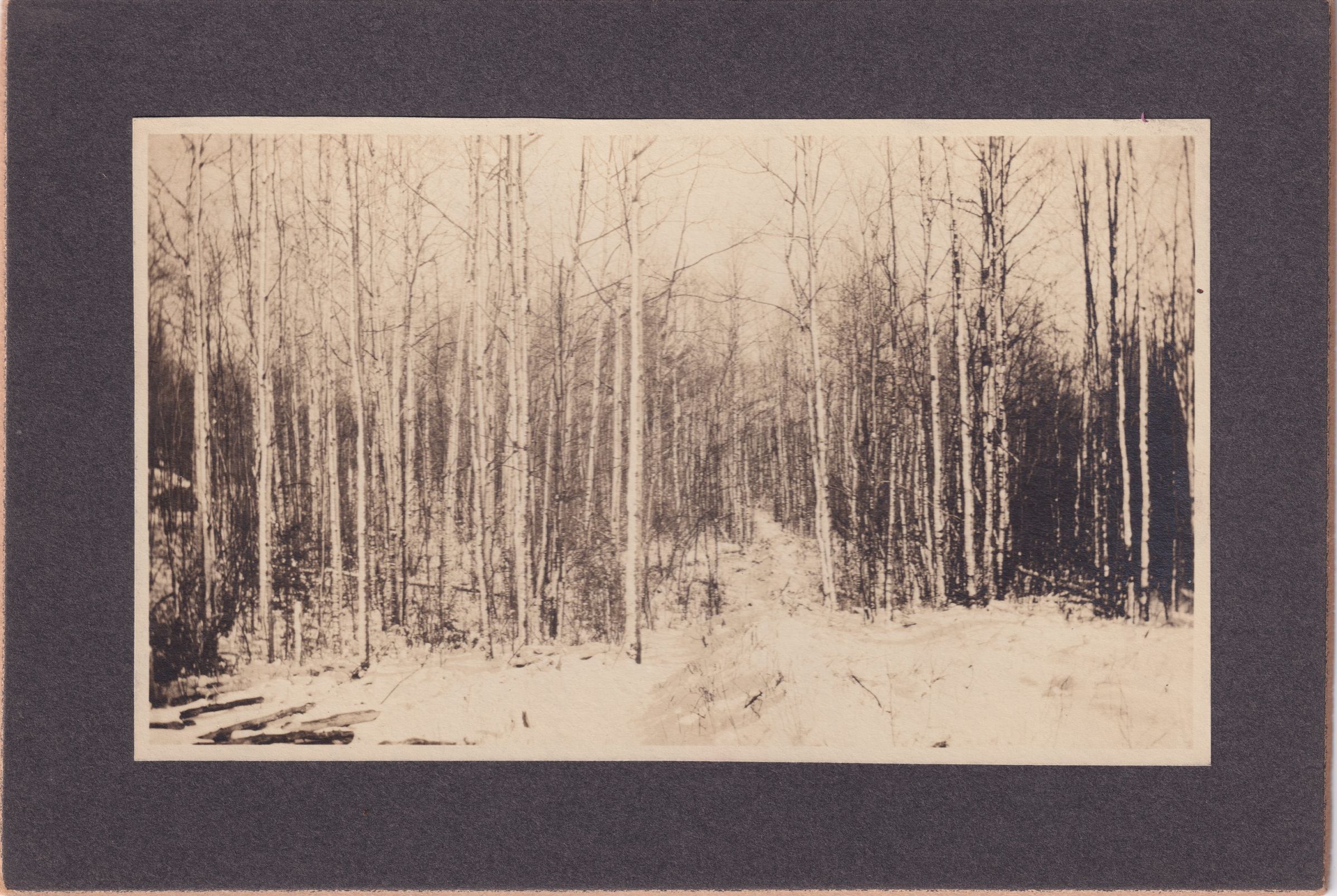 Photograph of a snowy forest, mounted on cardboard. Caption on reverse reads, "The Pipe Line to P.O. I walk through here every morning at 10:45 on my way to P.O. just to get your letter an hour sooner. (See.)" Caption on reverse of duplicate photo reads, "The "trail' to P.O. When in a hurry I go this way instead. Taken 2/22/09."Photograph Details
