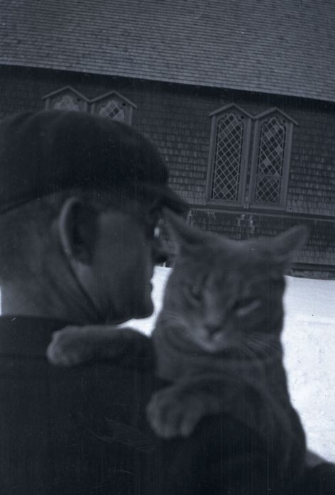 Negative of an unidentified man holding a cat. The picture was taken from behind him, with the cat looking at the photographer over his shoulder. The side of St. Luke's Church can be seen in the background. Most likely taken by Mary Ives Baldwin. This item is not fully cataloged but has been uploaded so the image is publicly available; if you would like us to prioritize cataloging this item, please contact the HSL Collections team.