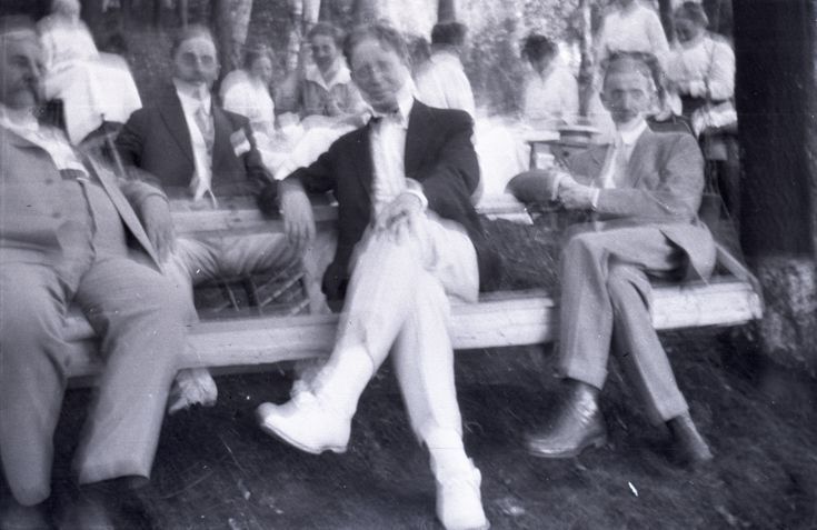 Blurry negative of three men sitting on a wooden bench with multiple people sitting in similarly in the background. The man sitting on the right is Ernest H. Baldwin, and the man just behind the bench is Edward R. Baldwin. Most likely taken by Mary Ives Baldwin. This item is not fully cataloged but has been uploaded so the image is publicly available; if you would like us to prioritize cataloging this item, please contact the HSL Collections team.