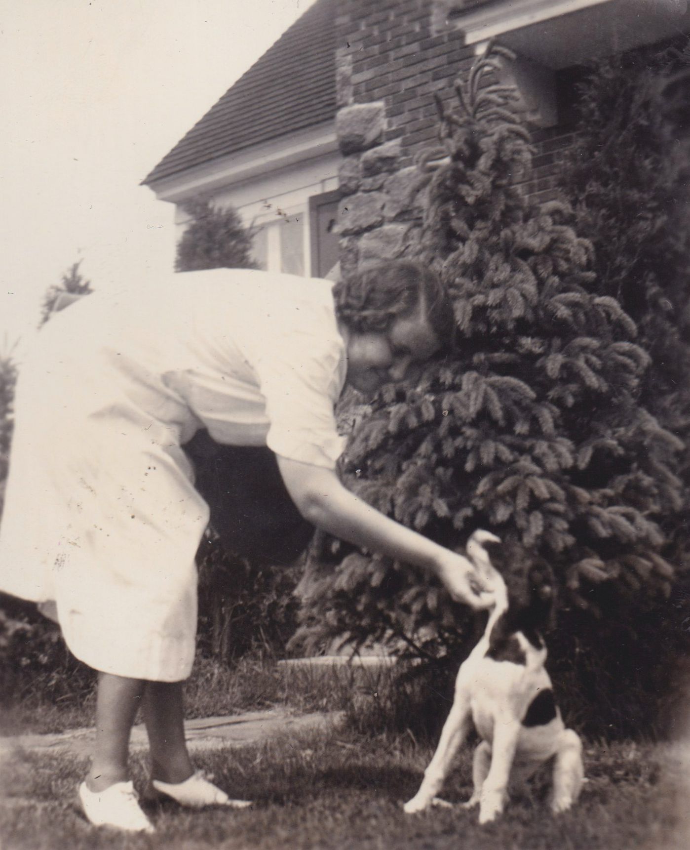 Black-and-White photograph of a woman bending over to scratch a puppy under the chin.