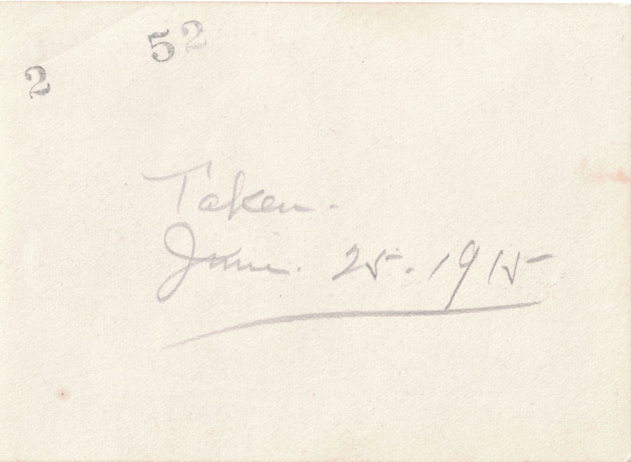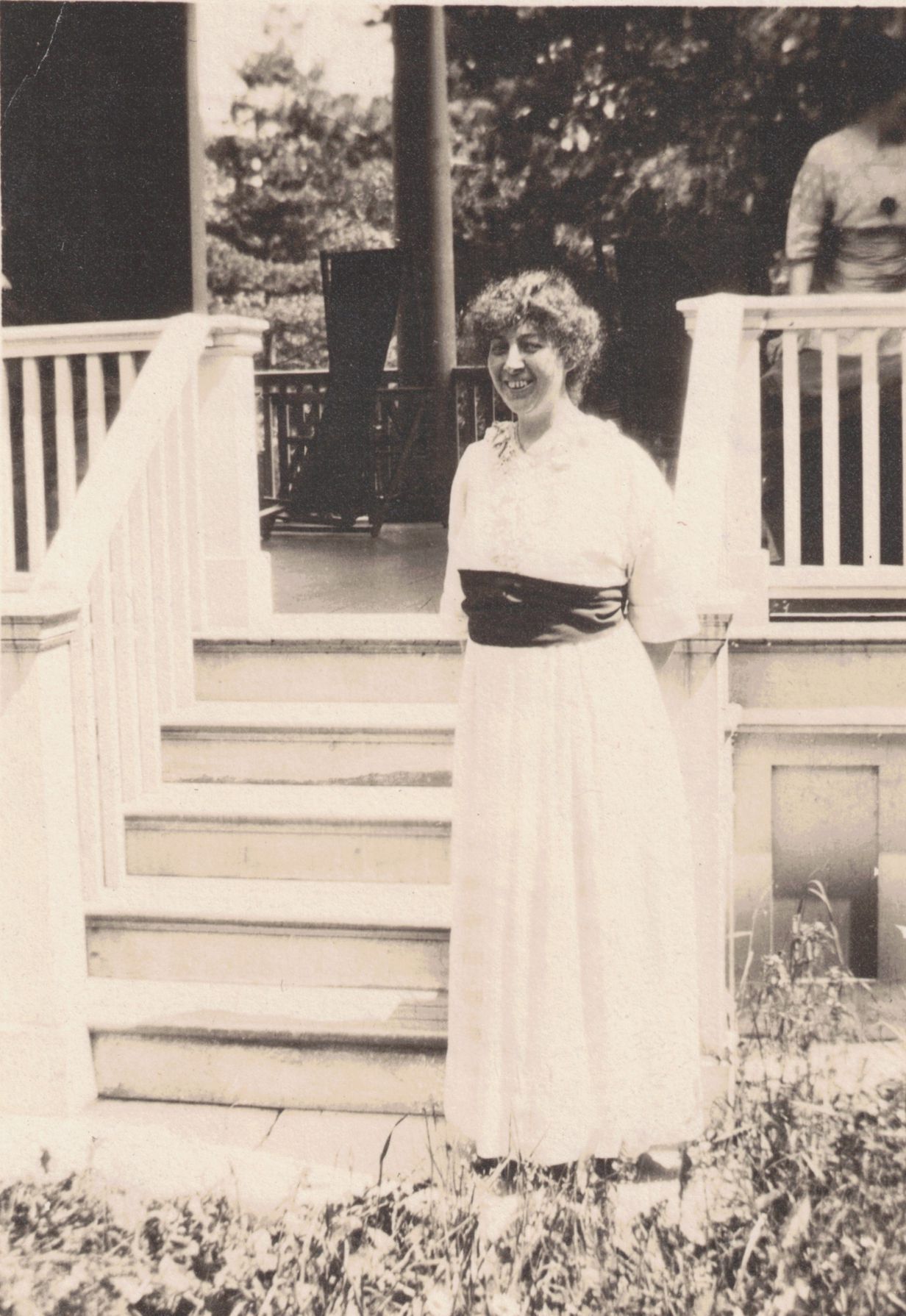 Photograph of Tarsilla Schuster in a white dress with a sash around the waist, standing in front of a porch with her hands behind her back. Handwritten caption on back reads, "Taken June 25, 1915."