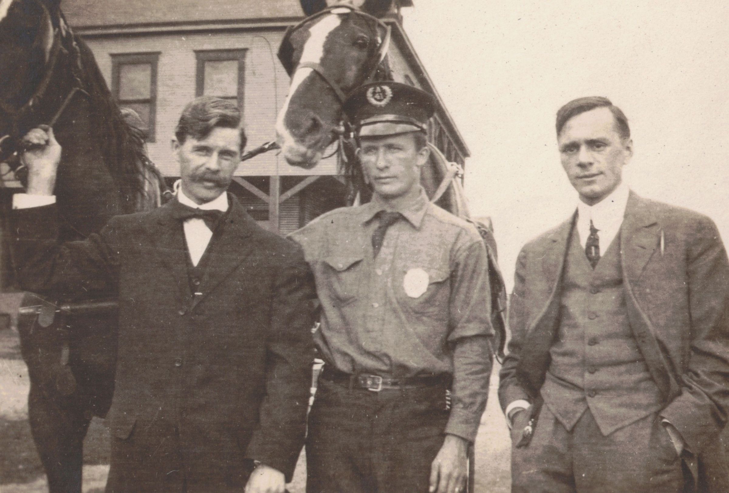 Photograph of William Schuster, far right, with two unidentified men and two horses. The man in the center is wearing a policeman's uniform.