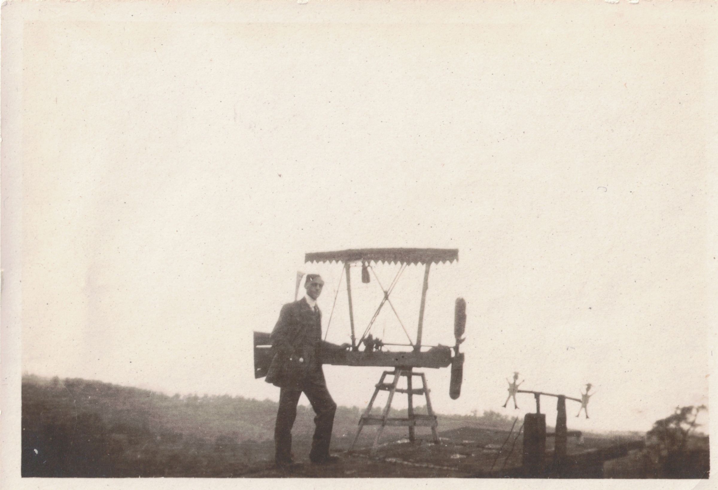 Photograph of William Schuster standing outdoors with what appears to be a model airplane on a stand.