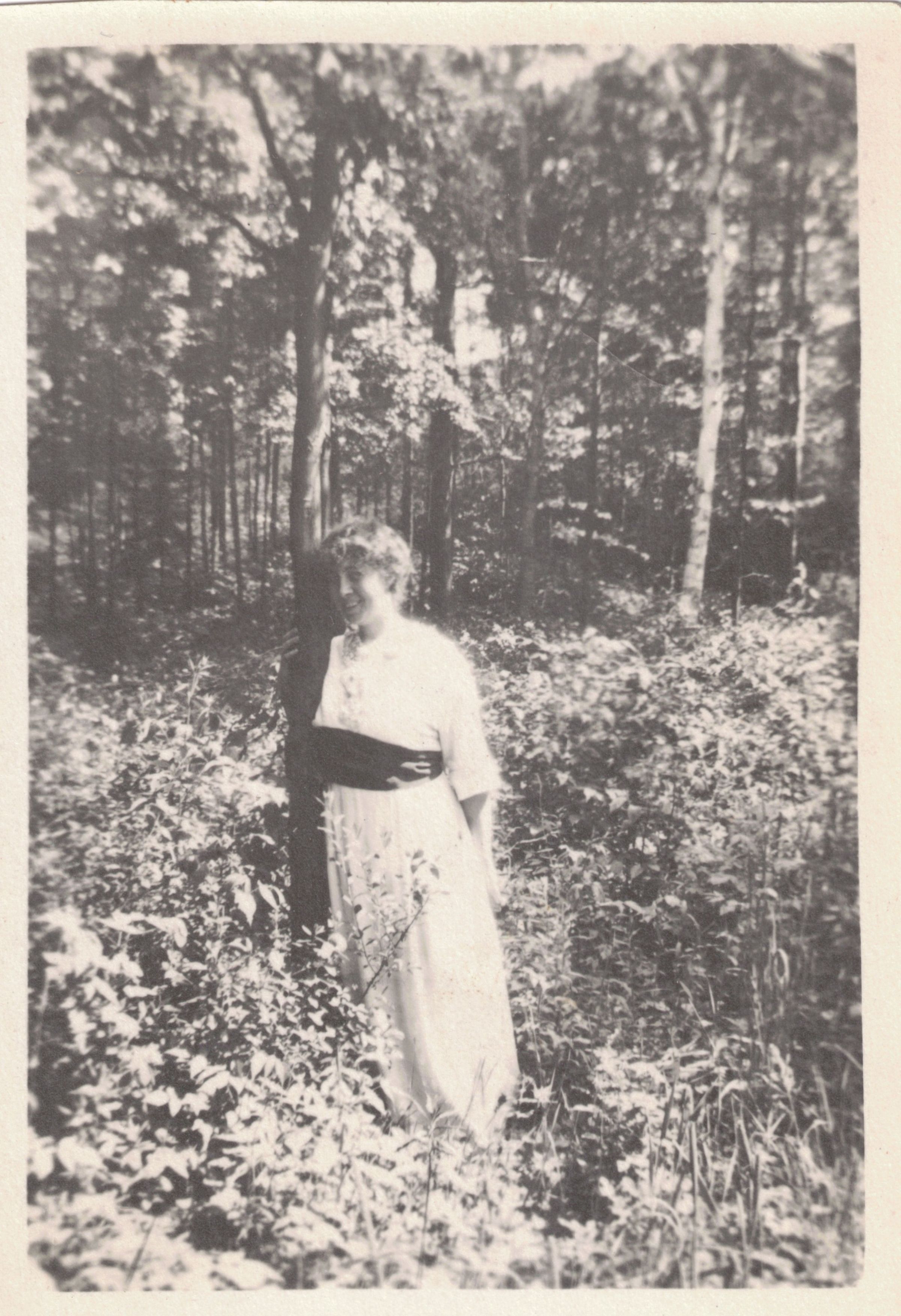Photograph of Tarsilla Schuster standing against a tree in the forest. She is smiling and wears a white dress with a waist sash.