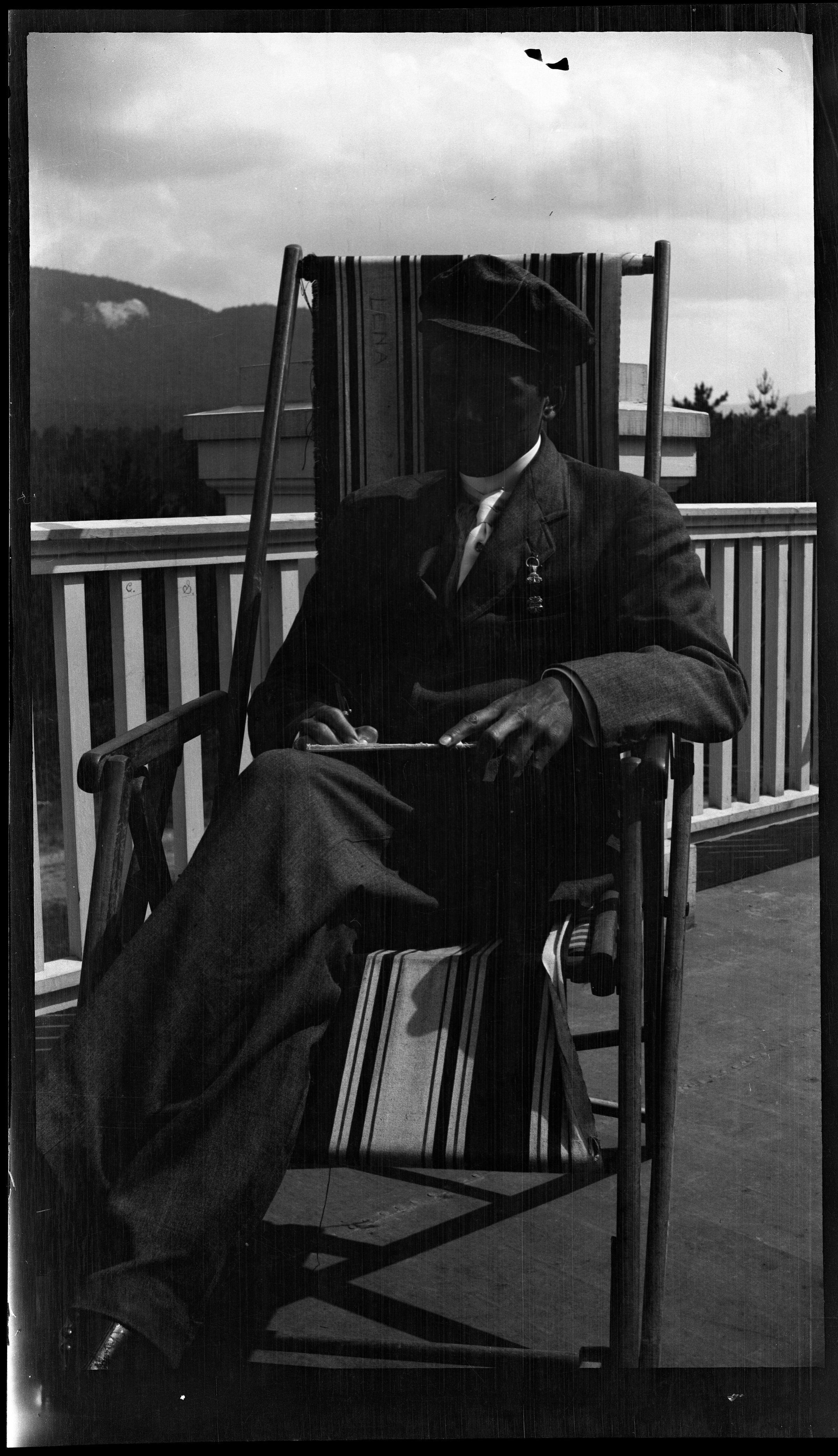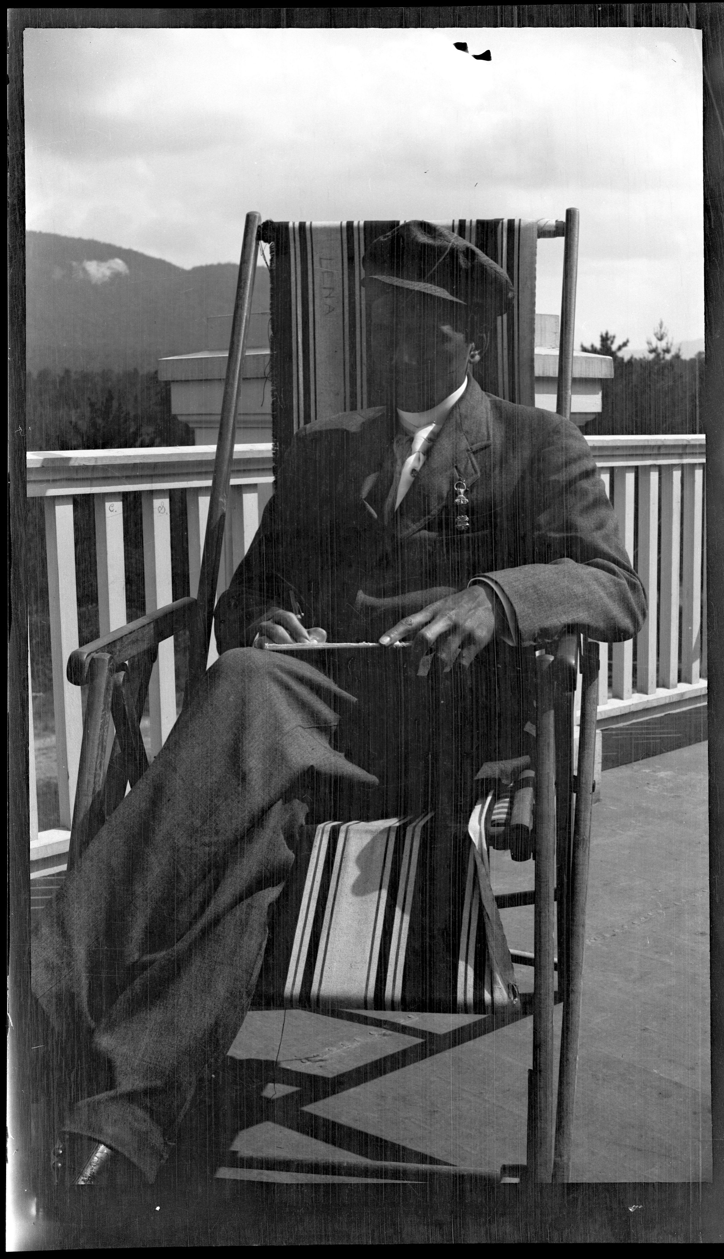 Negative showing image of William J. Schuster sitting on a deck chair on a porch, likely the Main Building at the New York State Hospital for Incipient Tuberculosis, AKA Ray Brook Sanatorium. He is wearing a suit and hat, and writing or sketching on paper in his lap.