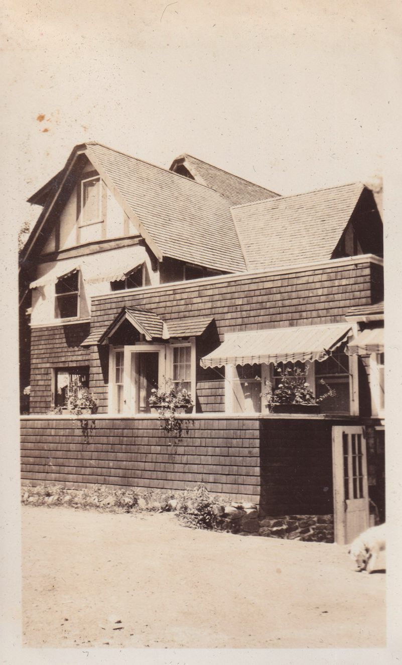 Black-and-White photograph of the Clara Black Cottage, on the driveway side. A dog can be seen standing in the driveway, probably the Jones Family's dog Peggy.