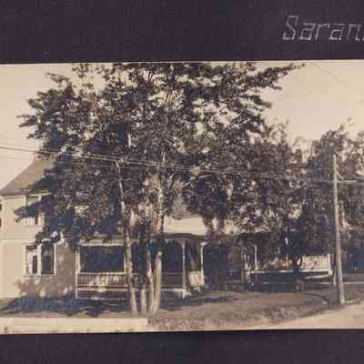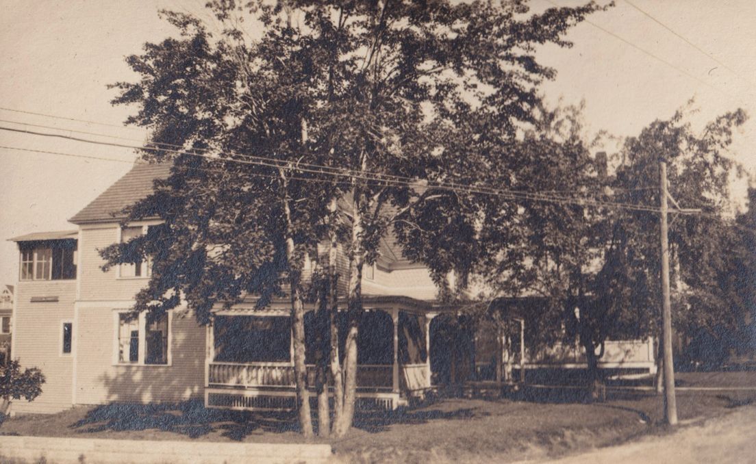 Black-and-white photograph of a large cure cottage, maybe at the corner of two streets. There is a tree between the cottage and photographer, obscuring part of the house. A large cure porch wraps around the front of the cottage, and a sleeping porch can be seen at the back of the house on the second floor.