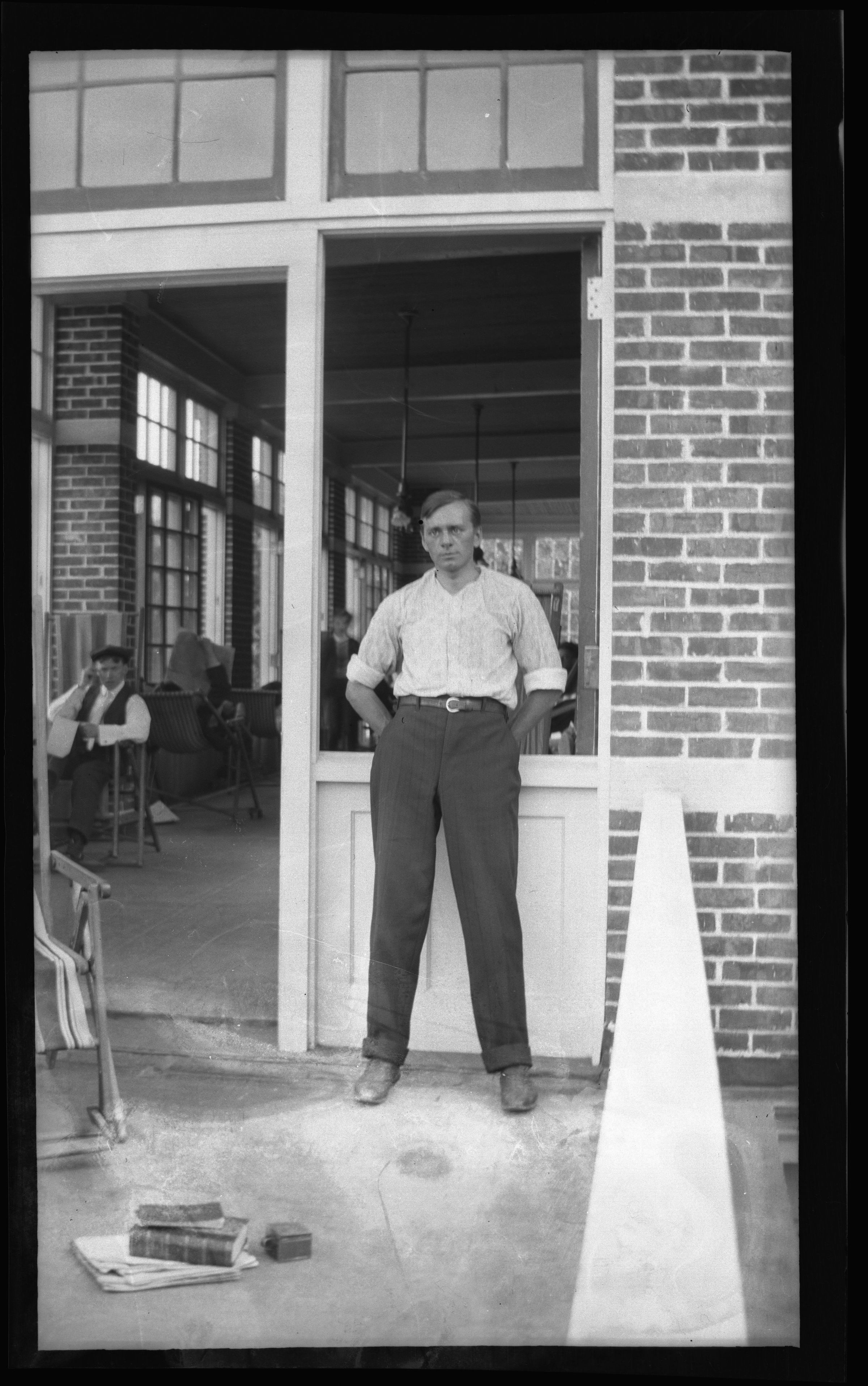 Negative showing image of William J. Schuster leaning against the open window of an enclosed cure porch with his sleeves rolled up. Patients are visible sitting on the porch behid him. There is a chair, a pile of books/notebooks, and a sputum cup on the ground at his right side. Photograph was taken at the New York State Hospital for Incipient Tuberculosis, AKA Ray Brook Sanatorium.Photograph Details