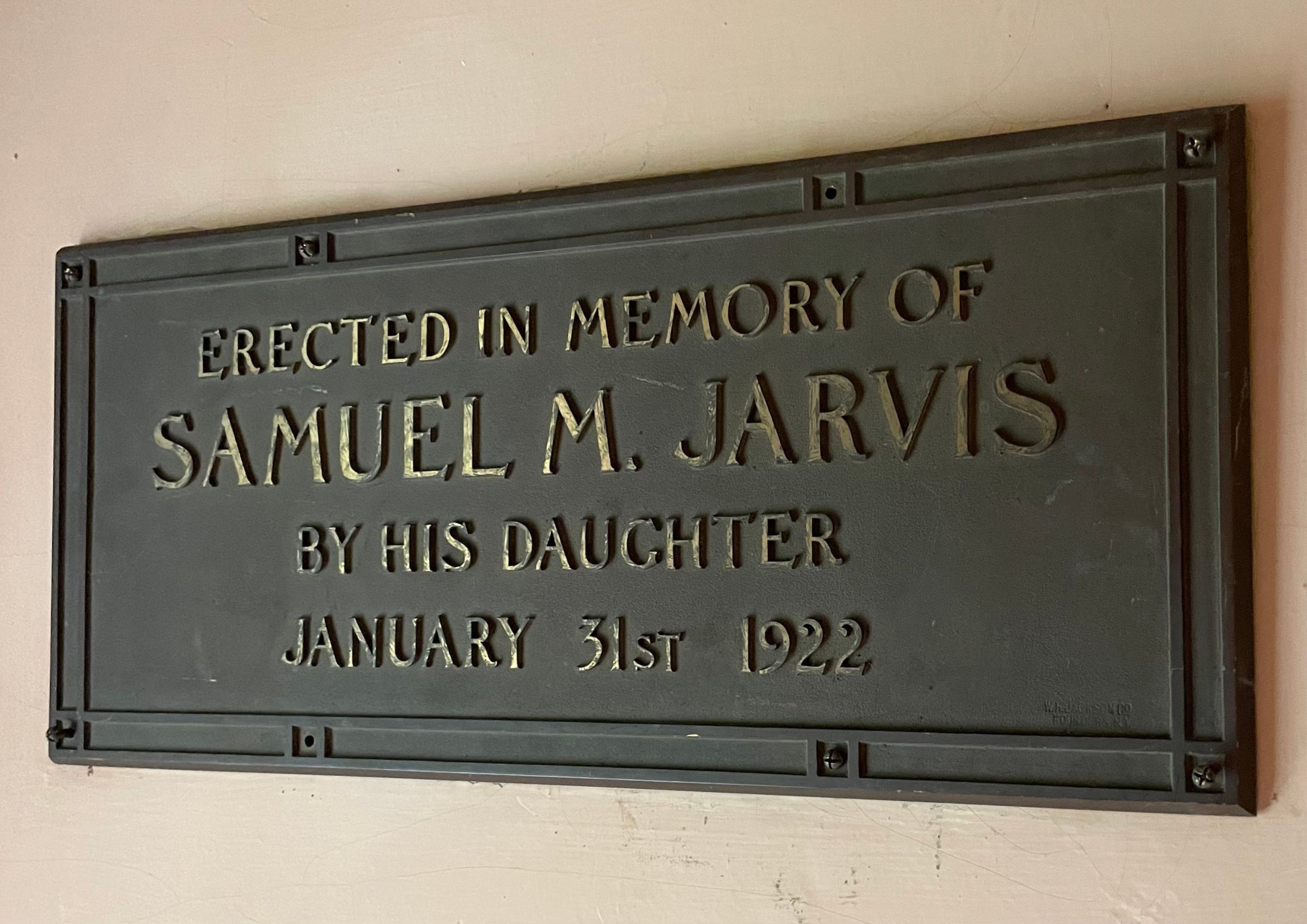 Bronze plaque from the Jarvis Cottage at Stony Wold Sanatorium. Plaque reads, "Erected in Memory of Samuel M. Jarvis, by His Daughter, January 31, 1922." The plaque hung in the front entryway of the building until September 2024.