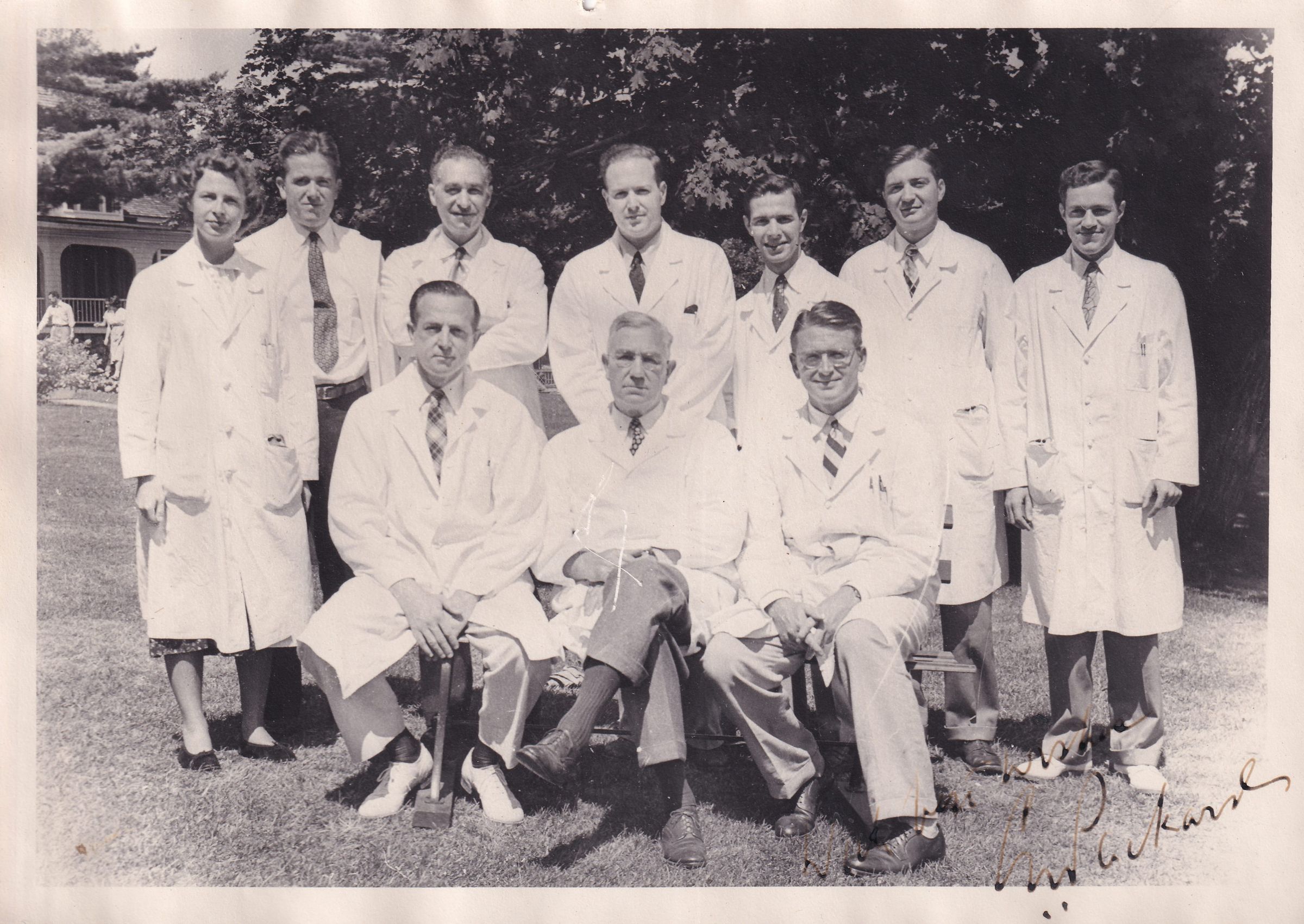 Black-and-white photograph showing a group of doctors in lab coats on the lawn at Trudeau Sanatorium. First row (from left): Dr. Gordon M. Meade, Dr. Edward N. Packard, Dr. Roger S. Mitchell. Second row (from left): unidentified [has possibly been identified in another photograph as a doctor from New York City completing a short post-graduate course, name unknown], Dr. Richard G. Gould, unidentified, Dr. Bertram H. Eckmann, unidentified, Dr. John H. Steidl, unidentified.