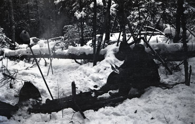 Negative of two unidentified people sitting on a log in a snow-covered forest. Taken by Mary Ives Baldwin. This item is not fully cataloged but has been uploaded so the image is publicly available; if you would like us to prioritize cataloging this item, please contact the HSL Collections team.