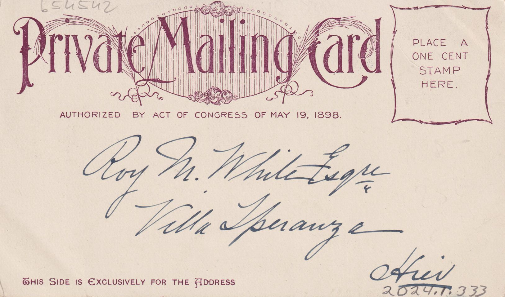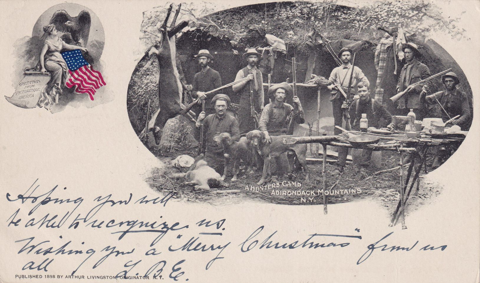 Postcard with a picture of a group of hunters at camp with their hunting dogs and dead deer. The postcard is addressed to Roy M. White.