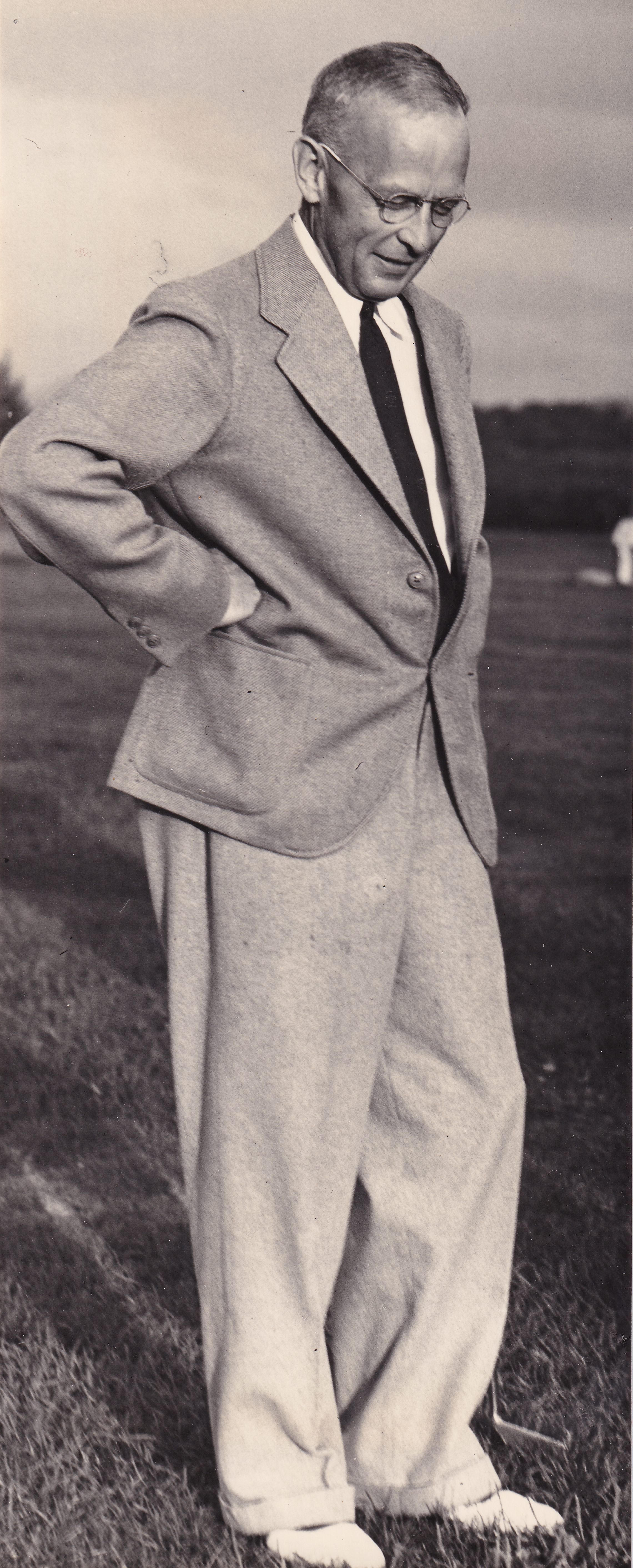 Black-and-white photograph of Dr. Harry Bray leaning on a golf club while standing outdoors in the grass. He is looking down and wearing a suit coat, dress pants, a tie, and glasses. A post-it note previously stuck to the photo read, "Dr. Bray. 'He always walked with a golf stick.' Josephine Nefferman, Ray Brook 35-36."