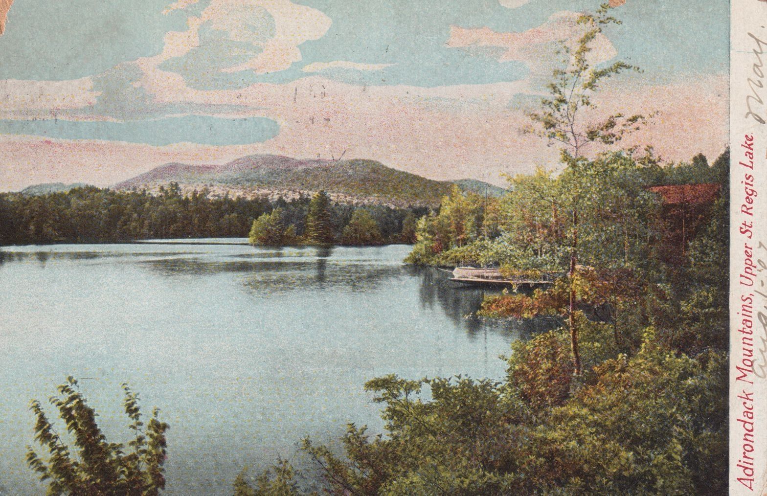 Color postcard showing the shore of Upper St. Regis Lake. Printed caption on front reads, “ Adirondack Mountains, Upper St. Regis Lake.” Printed by Hugh C. Leighton Co., Portland, ME. Used, undivided back, small white space on front for message, postmarked Saranac Lake, August 1, 1907.