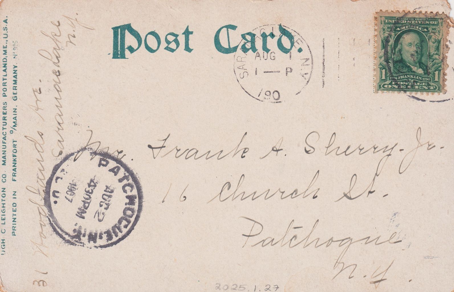 Handwritten note on front reads, “Aug. 1 ‘07. May.” Note on reverse reads, “31 Woodlands Ave., Saranac Lake, N. Y.” Mailed to Mr. Frank A. Sherry, Jr., 16 Church St., Patchogue, NY.Subject Place
