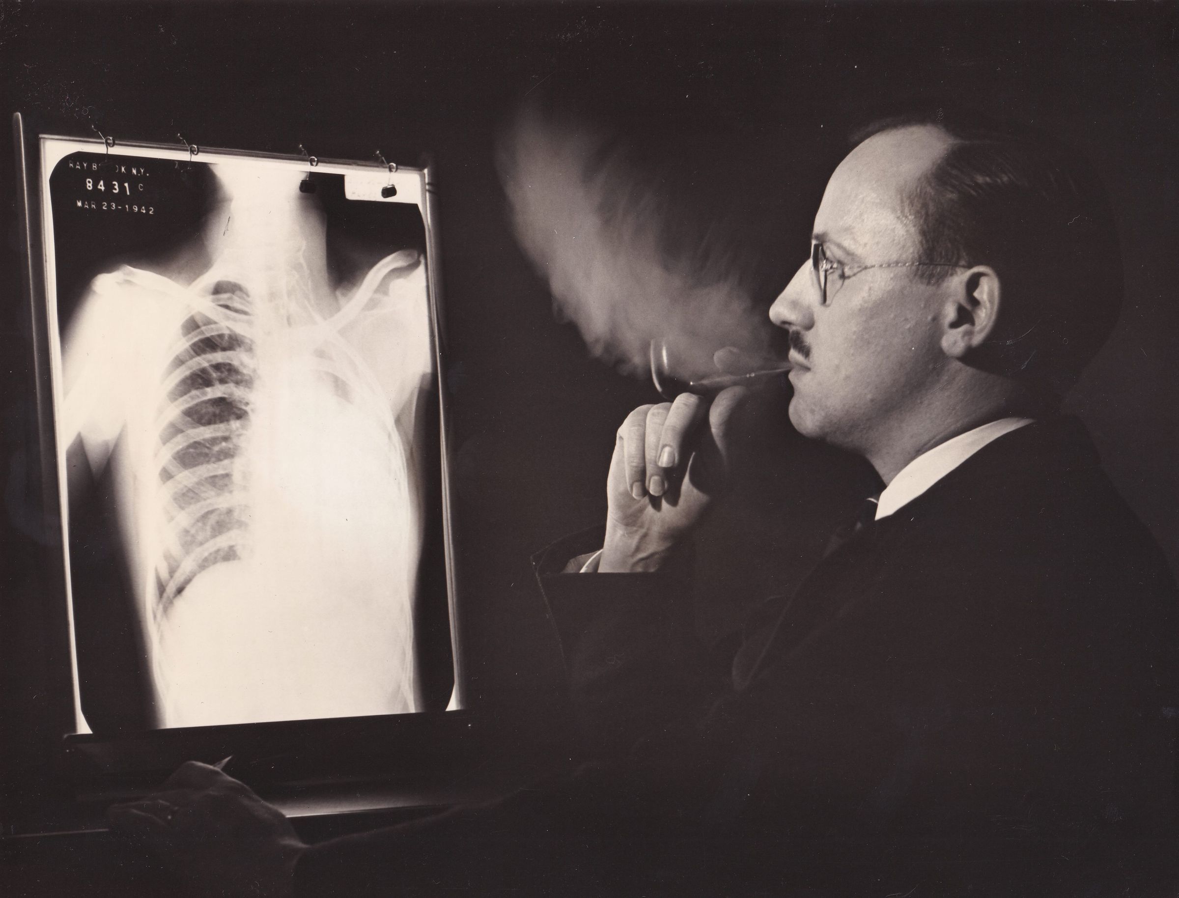 Photograph of Dr. Berkeley Zinn at the New York State Hospital for Incipient Tuberculosis AKA Ray Brook Sanatorium, smoking a pipe and looking at a chest x-ray in a darkened room. He is seen in profile, holding the pipe to his lips with his right hand. The x-ray on the illuminated viewer is dated March 23, 1942.