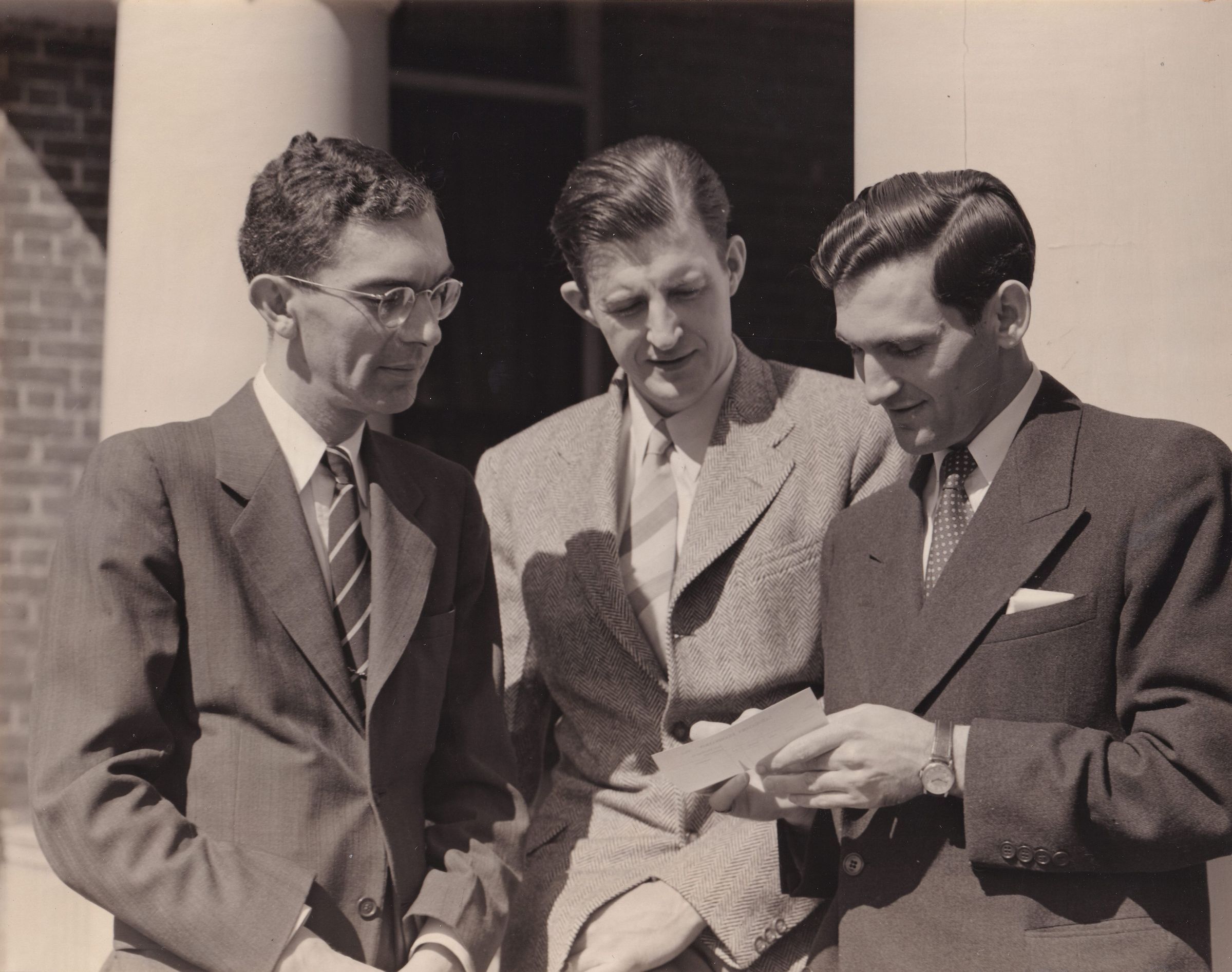 Photograph of Dr. Herbert Shultz, Dr. James Monroe, and Dr. Ben Fruhlinger standing in front of a building while consulting a card held by Dr. Fruhlinger. They are all wearing suits and ties, and Dr. Shultz has glasses.