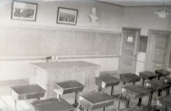 Negative of a classroom full of wooden desks with a chalkboard and teacher's desk at one end. Most likely taken by Mary Ives Baldwin. This item is not fully cataloged but has been uploaded so the image is publicly available; if you would like us to prioritize cataloging this item, please contact the HSL Collections team.
