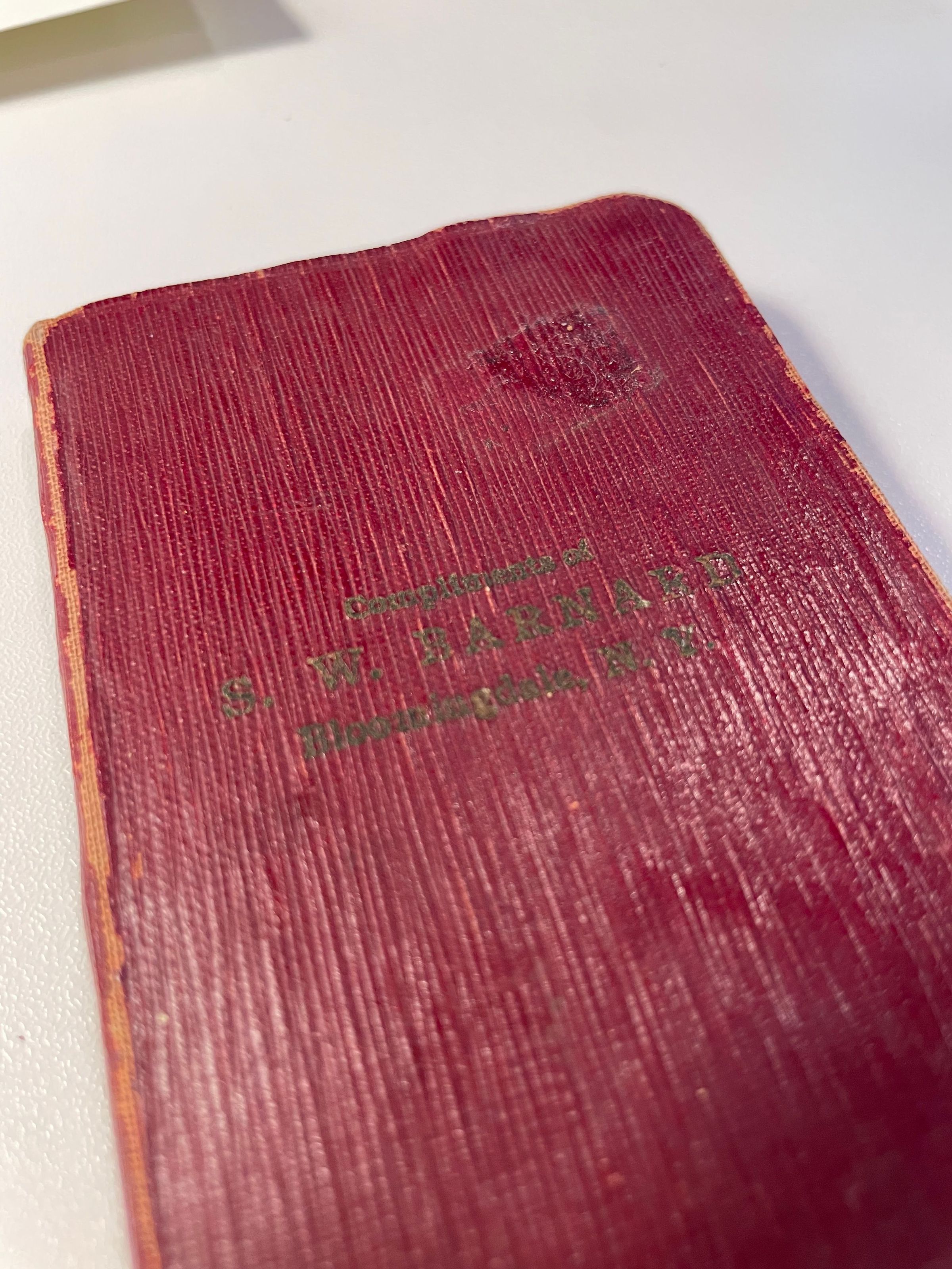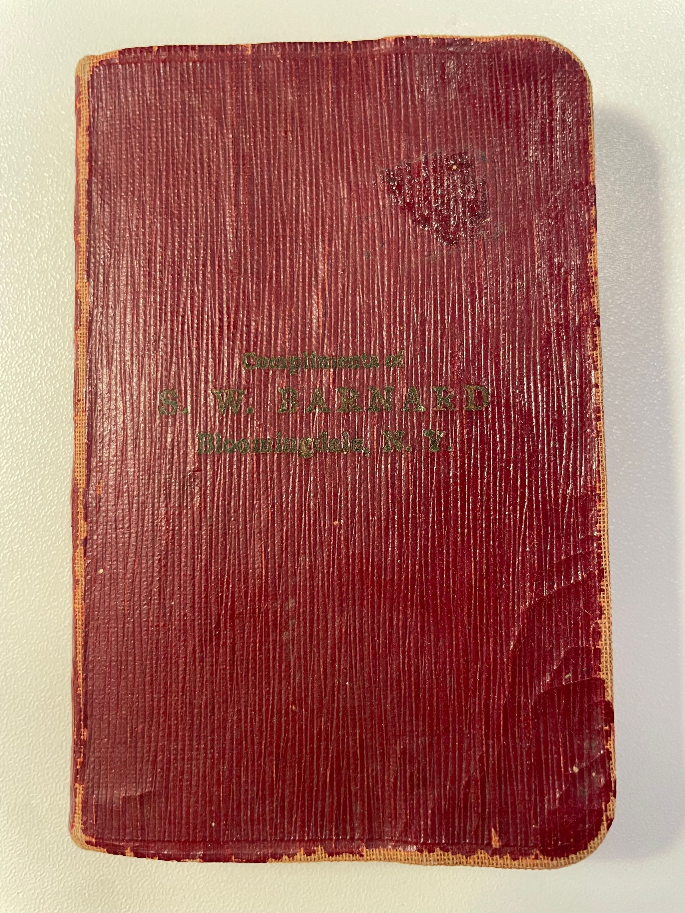 Small agenda/almanac with "Compliments of S. W. Barnard, Bloomindale, N.Y." printed on the front. Has daily calendar pages as well as tips, logs, maps, and other useful information printed inside. Likely created as a promotional item for Sydney W. Barnard's General Store in Bloomingdale. Some day pages have names written on them. Yearly calendars are dated 1932 and 1933. Red leatherette soft cover.Lexicon