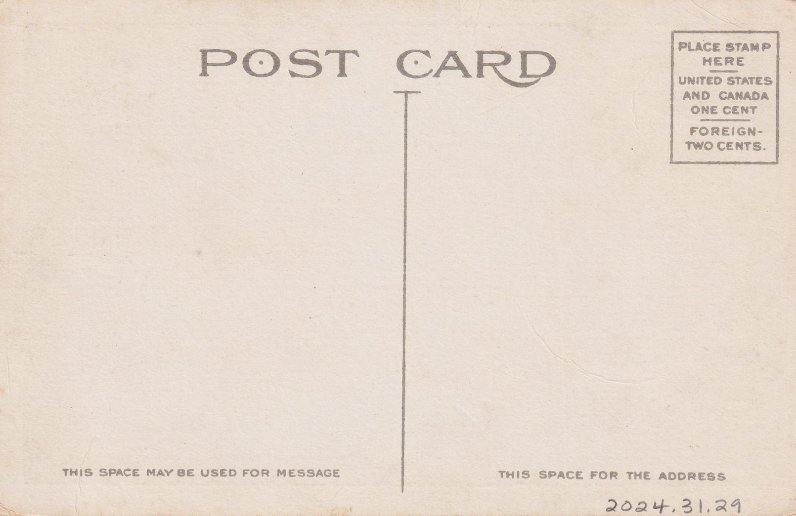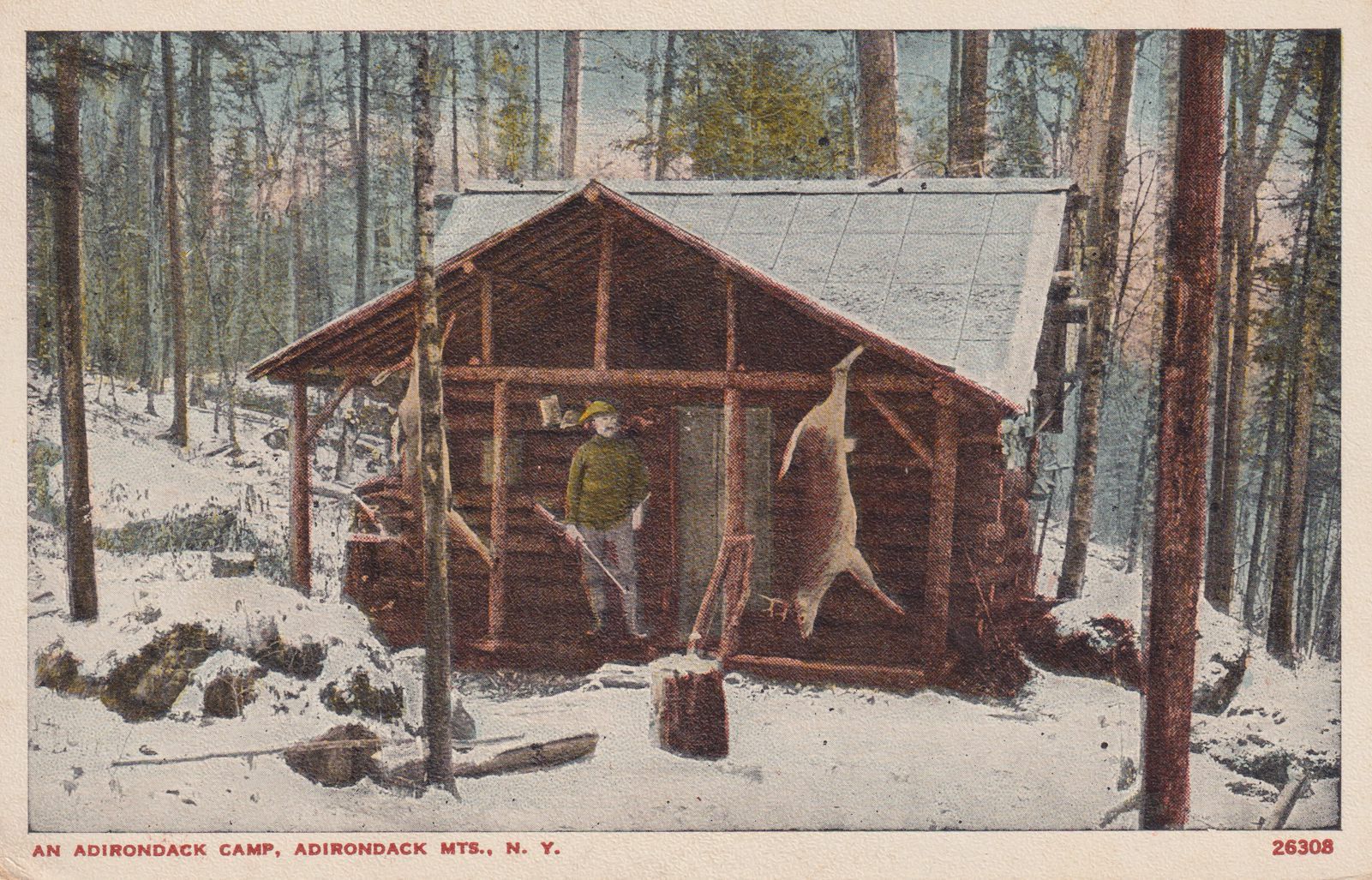 Color postcard showing a log cabin in the snowy woods. There is a man with a rifle standing on the porch, with a deer carcass hanging next to him. Printed caption on front reads, "An Adirondack Camp, Adirondack Mts., N. Y." No printer's mark. Unused, divided back, white border.Subject Place