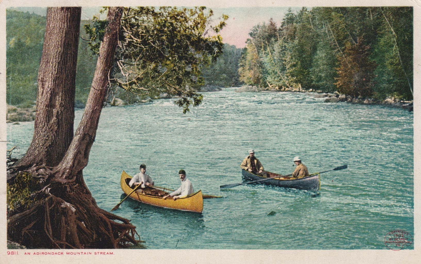Color postcard showing guides or sports in guideboats on an unidentified body of water. Printed caption on front reads, "An Adirondack Mountain Stream." Printed by Detroit Publishing Co. Used, divided back, white border, postmarked Saranac Lake, August 20, 1908.