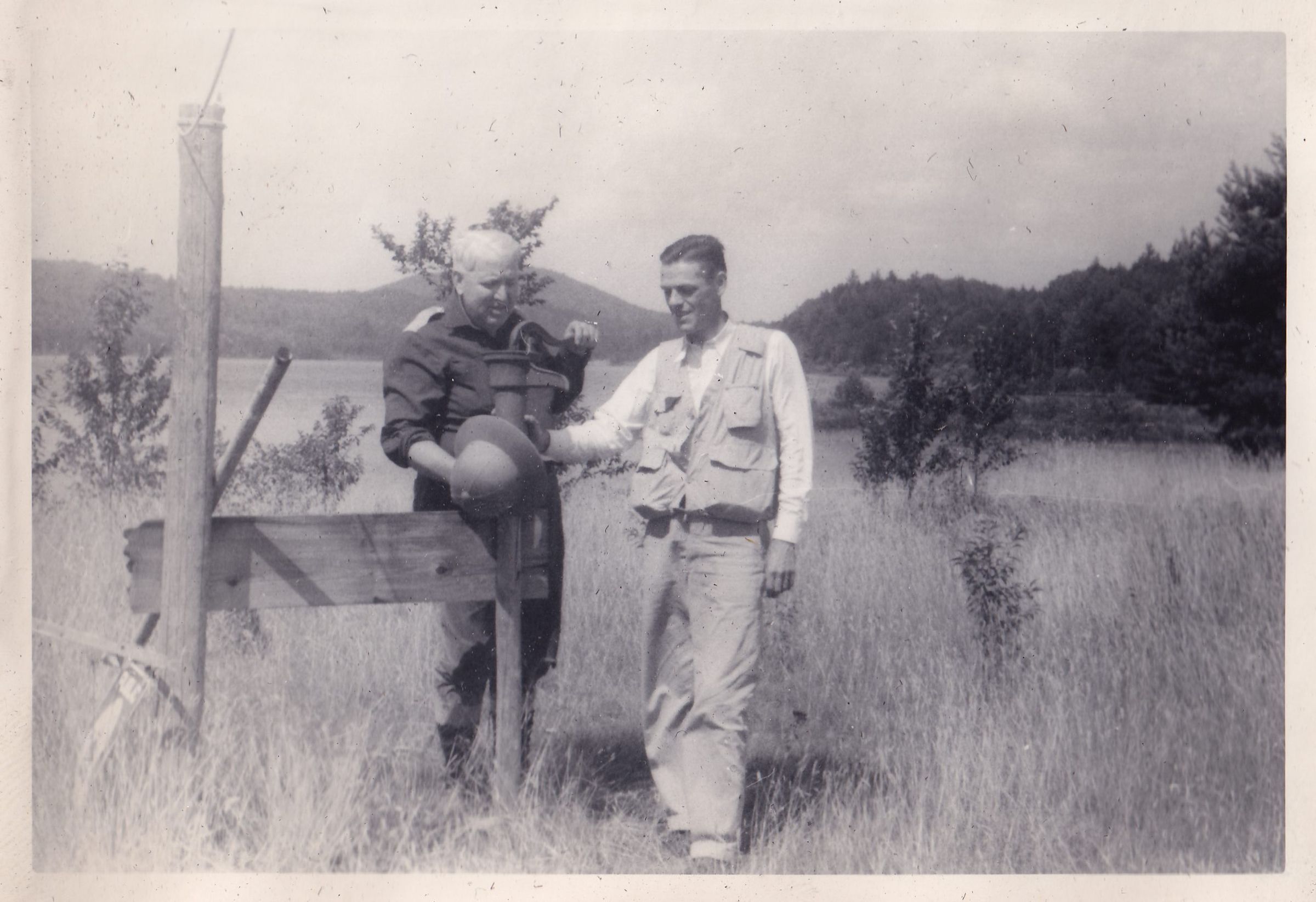 Black-and-White photograph of Ray Burmaster standing outdoors with an unidentified man. They are both holding on to the an old-fashioned well pump.