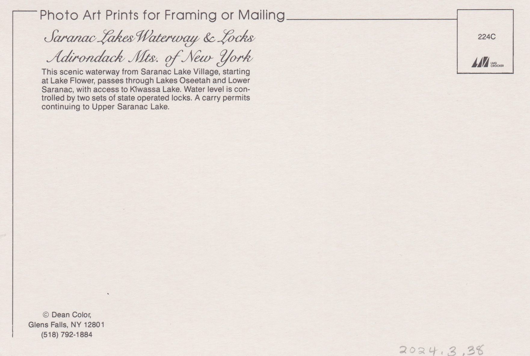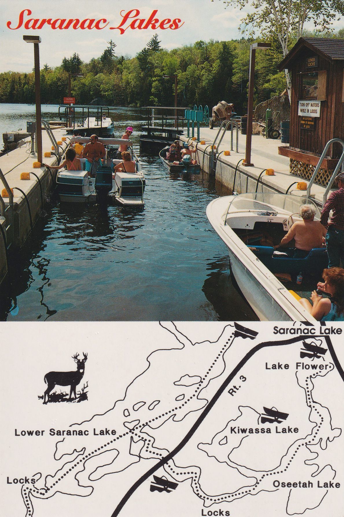 Color postcard showing boats in the locks between Lower Saranac Lake and Oseetah. The bottom half of the card has a black and white map of Lake Flower, Kiwassa Lake, Oseetah, and Lower Saranac Lake. Printed caption on front reads, "Saranac Lakes." Printed by Dean Color, Glens Falls, NY. Unused, divided back.Subject Place