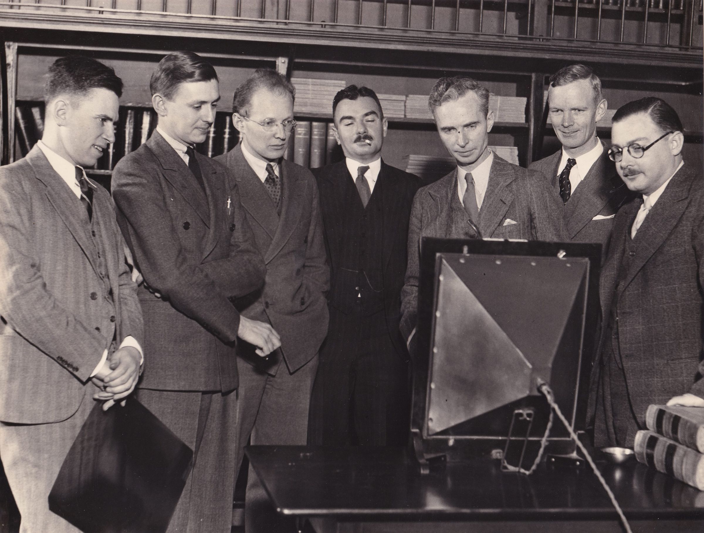 Photograph of a group of seven men looking at an x-ray. They are facing the camera and the x-ray viewer is placed on a table in front of them. They appear to be in a library setting.