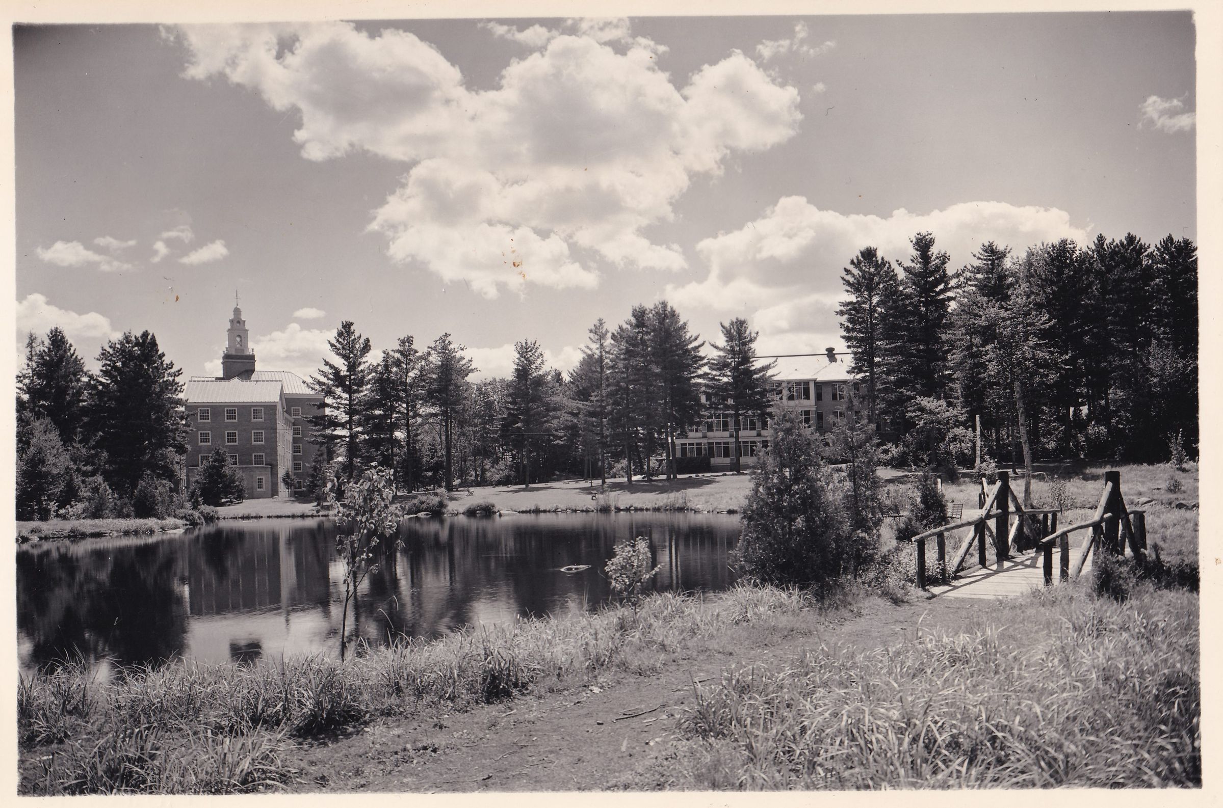 Photograph of the duck pond at the New York State Sanatorium for Incipient Tuberculosis, AKA Ray Brook, looking toward the Infirmary and Main Building. A small footbridge is visible to the right.