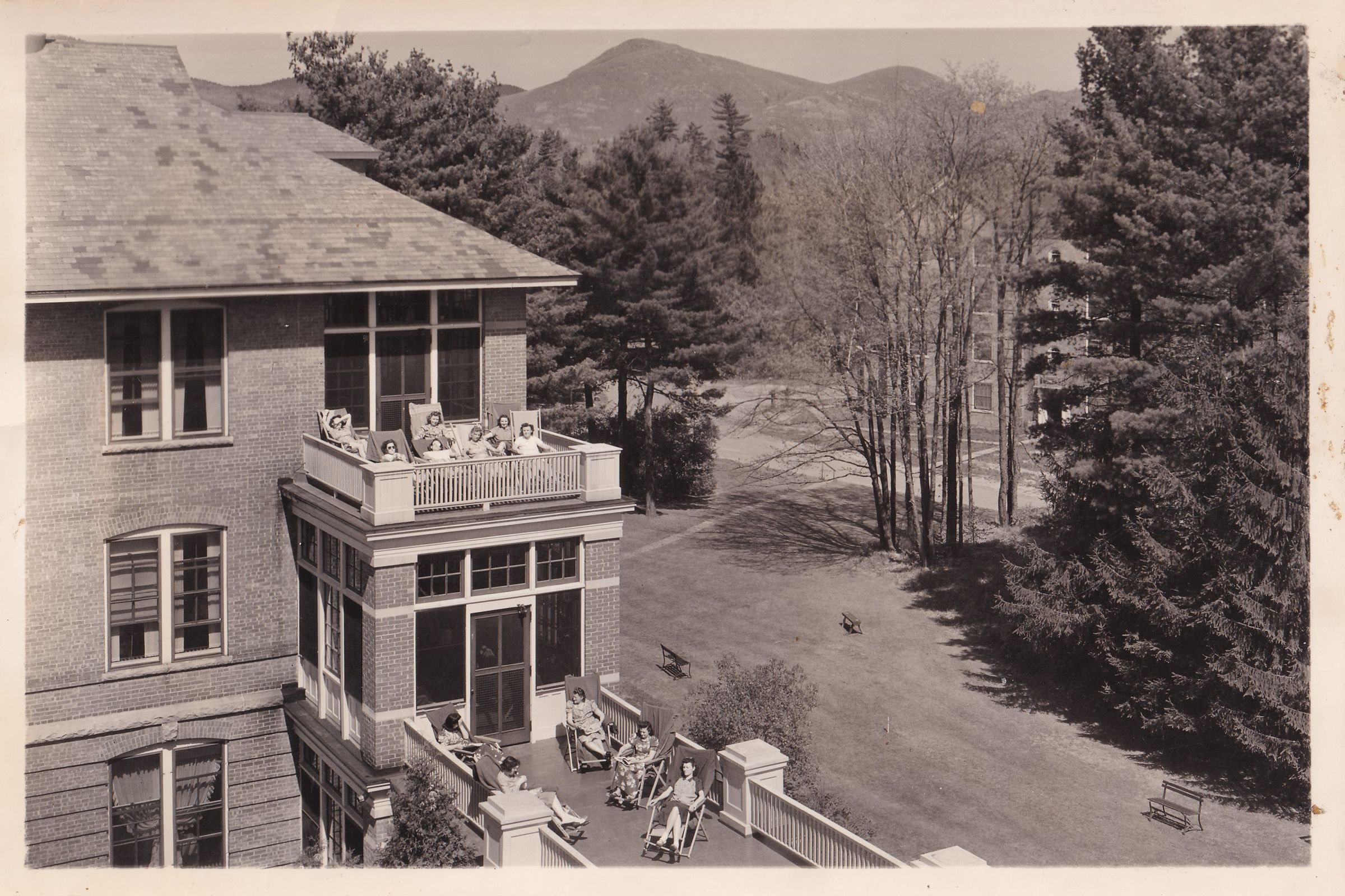 Photograph of the corner of the East Wing at the New York State Hospital for Incipient Tuberculosis, AKA Ray Brook Sanatorium, looking to the southeast. Two stories of porches are visible, and female patients are seated out on them in folding deck chairs.