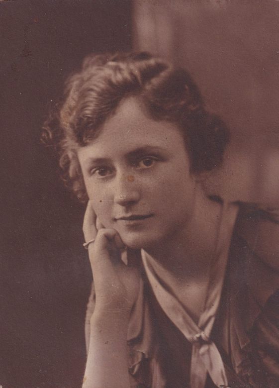Black-and-White studio portrait photograph of Amy White Jones. She is leaning her chin on one hand.