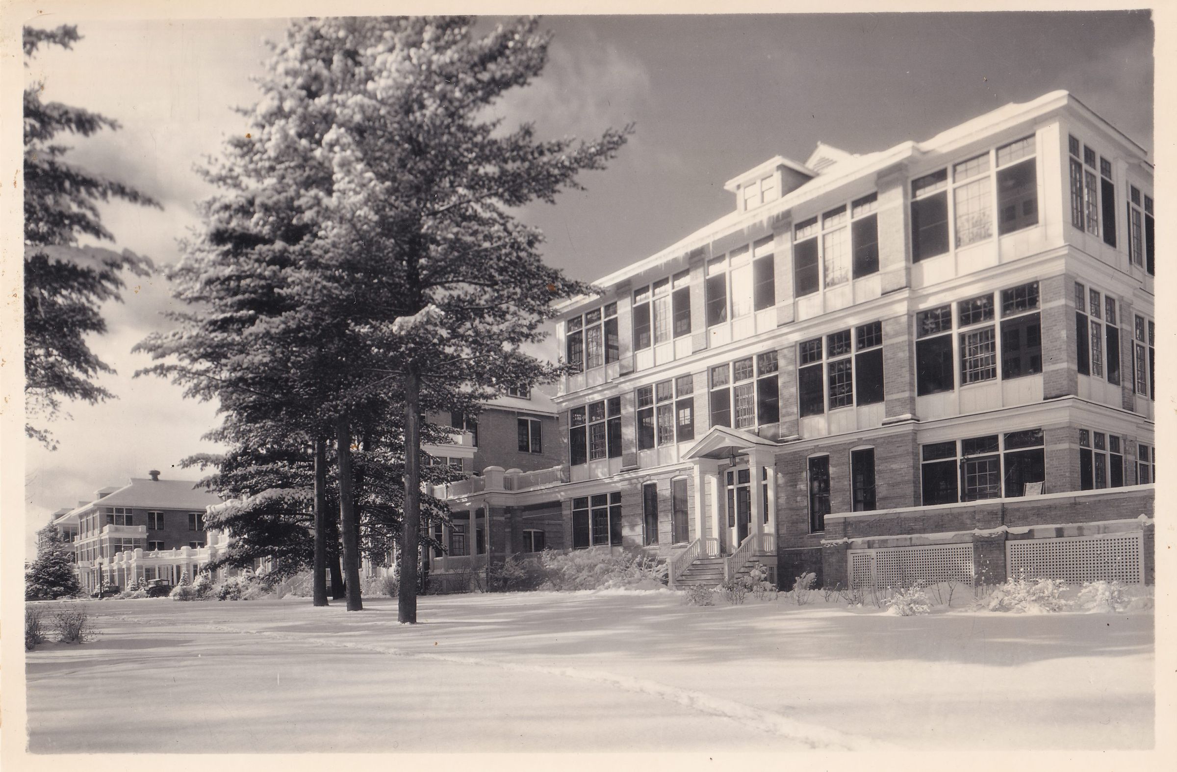 Photograph of the front/south facade of the Main Building at the New York State Hospital for Incipient Tuberculosis, AKA Ray Brook Sanatorium. The photograph was taken looking across the front of the McDonald Wing. The building and grounds are covered in snow.