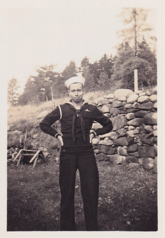 Black-and-White photograph of a man in military uniform standing outside. The photograph was likely printed by Kollecker's Kodak and Gift Shop.