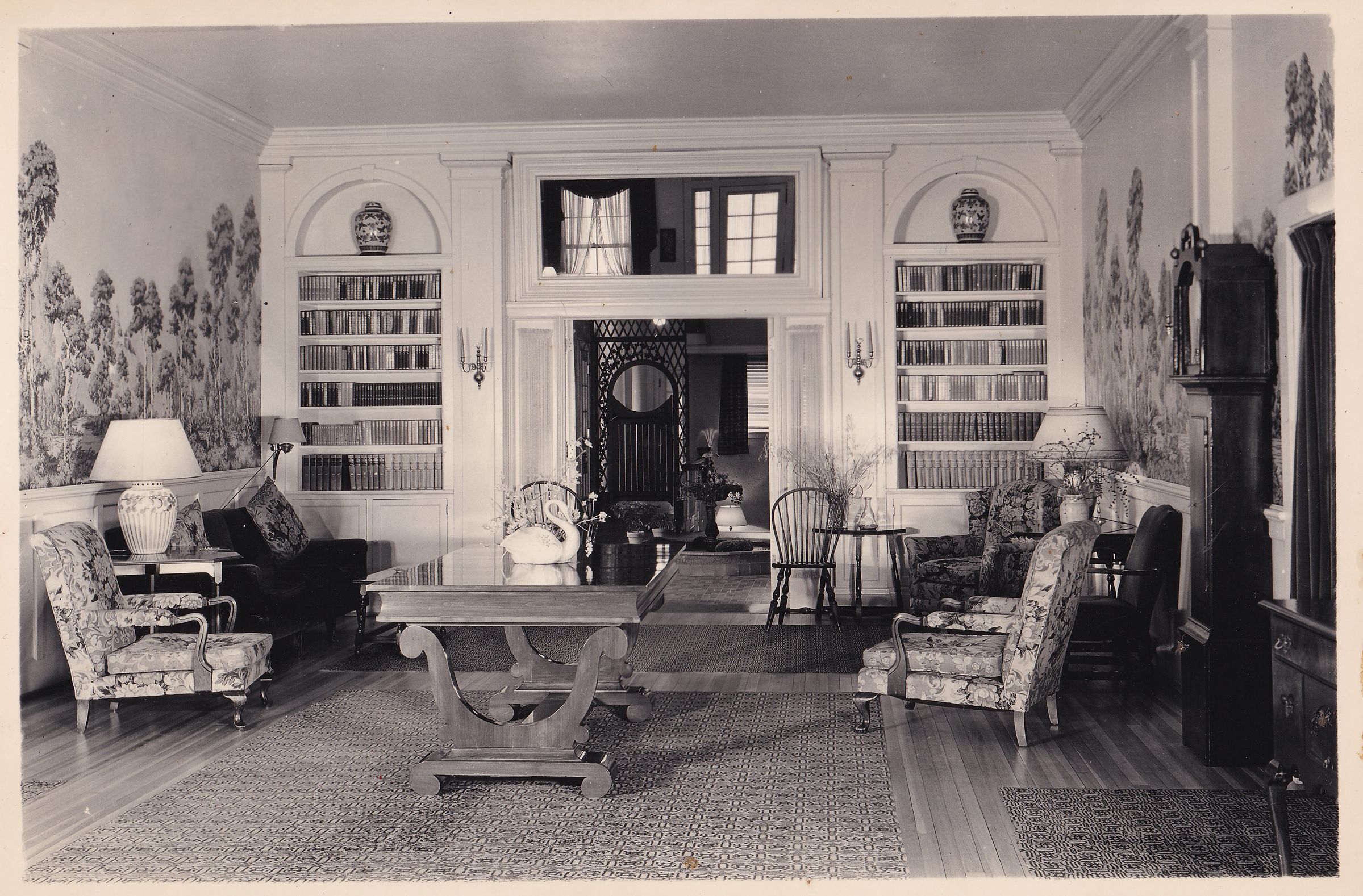 Photograph of a sitting area in the Main Building at the New York State Hospital for Incipient Tuberculosis, AKA Ray Brook Sanatorium. Couches and chairs are grouped around a large table, and built-in bookcases flank an opening with a French door topped by a large mirror. The room has wallpaper with images of trees.
