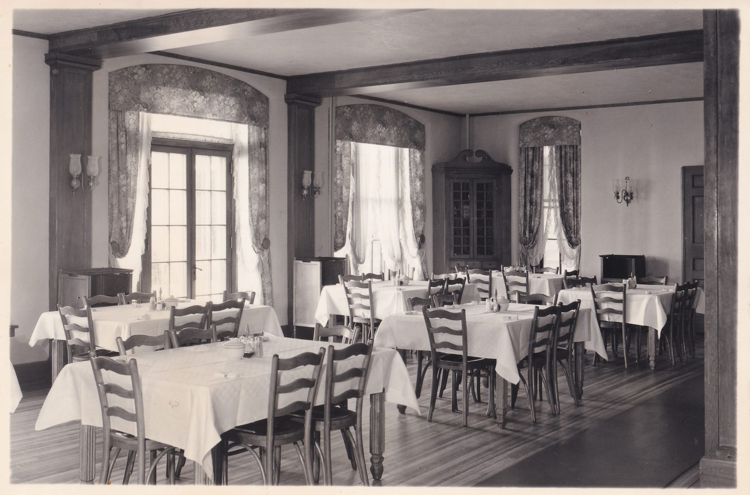 Photograph of a dining room at the New York State Hospital for Incipient Tuberculosis, AKA Ray Brook Sanatorium. There are rows of rectangular tables with six chairs, and the tables are set for a meal. There are floral curtains around the windows.