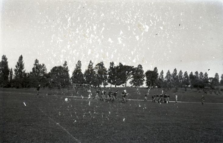 Negative of a football game taking place on a large field. Small parts of the image are obscured by bits of paper stuck to the surface of the negative. Most likely taken by Mary Ives Baldwin. This item is not fully cataloged but has been uploaded so the image is publicly available; if you would like us to prioritize cataloging this item, please contact the HSL Collections team.