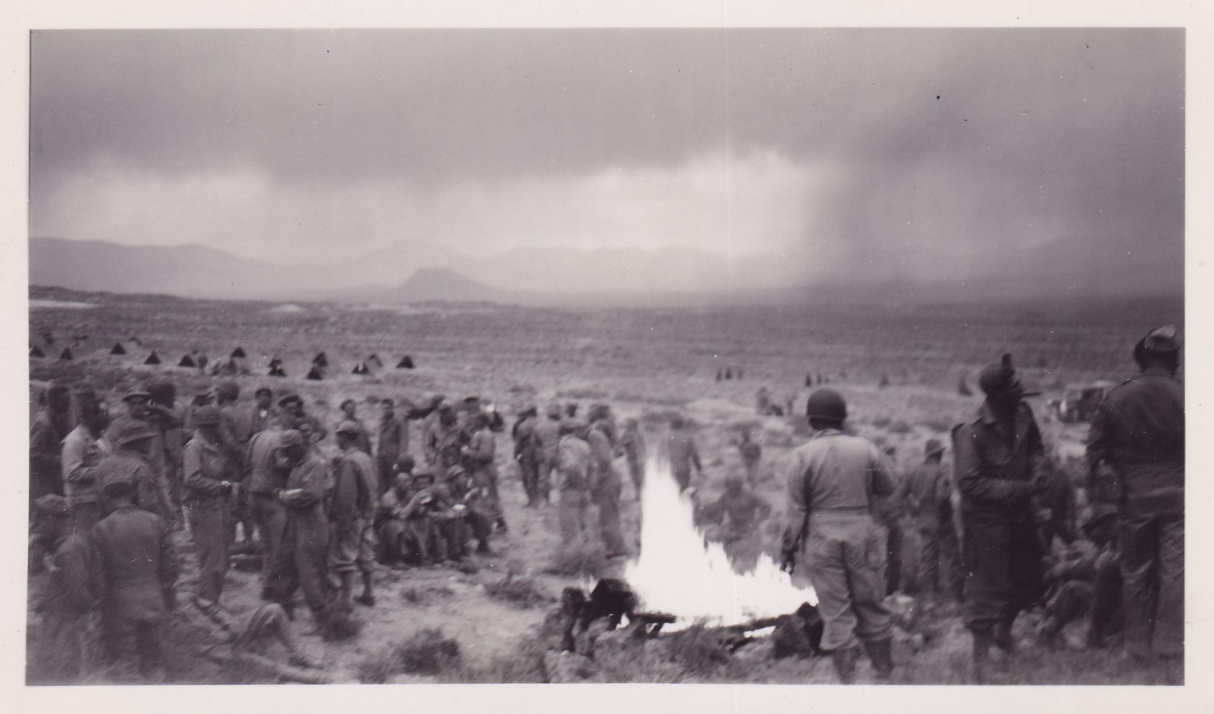 Black-and-White photograph of a large group of soldiers in the desert around a bonfire.