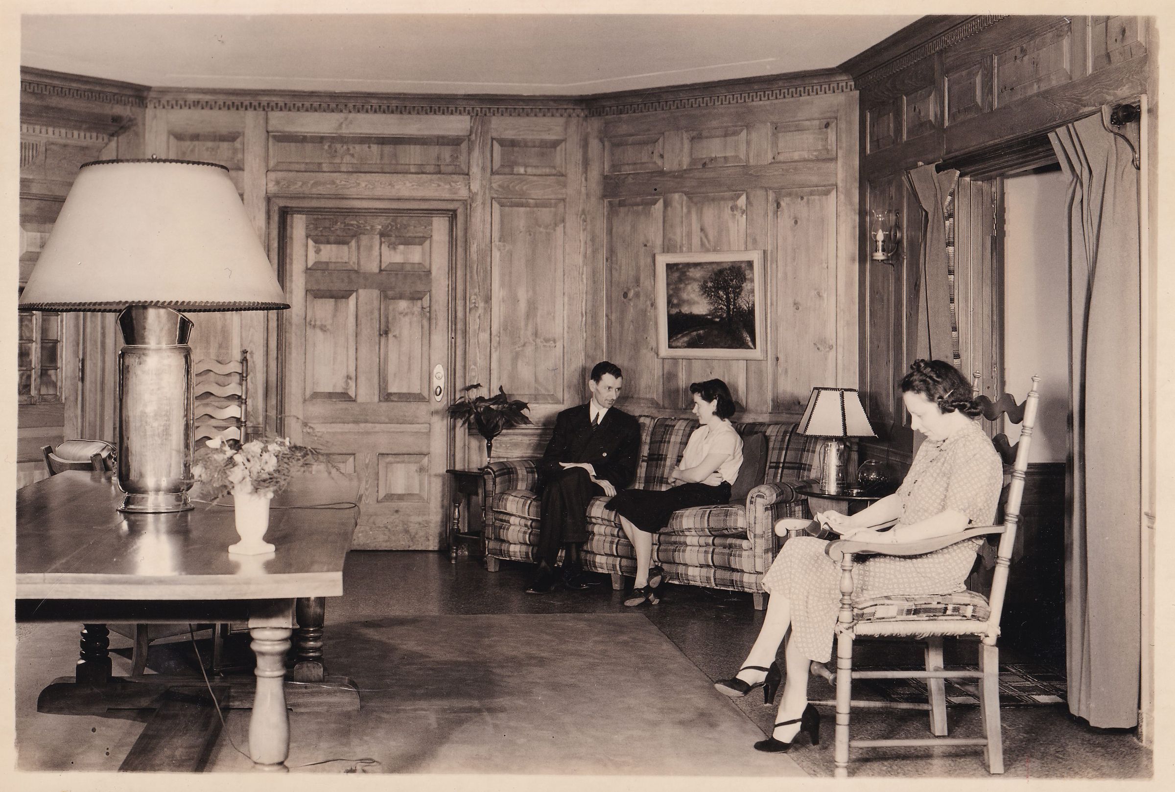 Photograph of a group of people, possibly patients, sitting in the lobby of the Infirmary Building at the New York State Hospital for Incipient Tuberculosis, AKA Ray Brook Sanatorium. At center, a man and a woman are talking on a plaid couch. At right, a woman is reading a book in a wooden chair. The room has wood paneling.