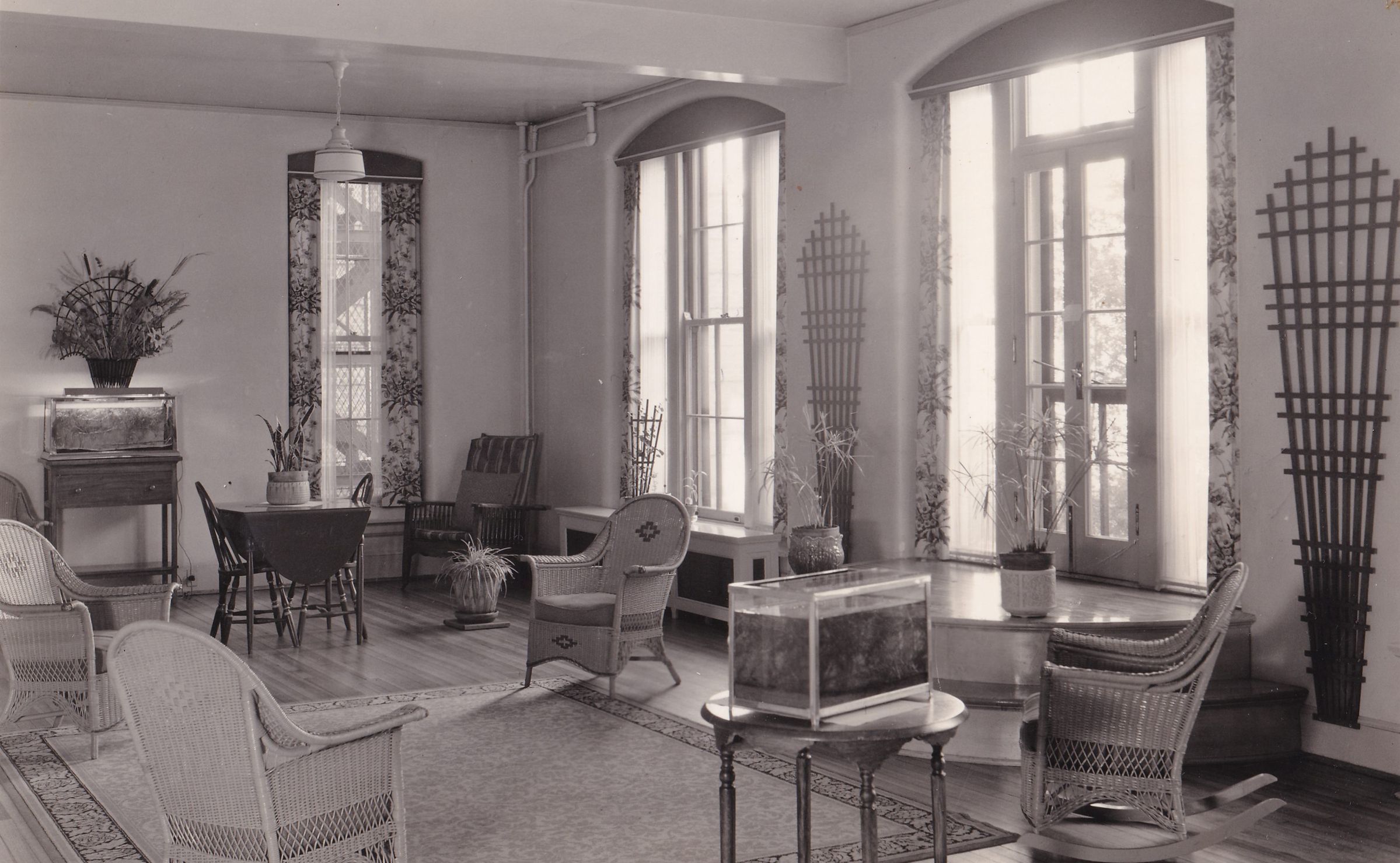Photograph of the solarium at the New York State Hospital for Incipient Tuberculosis, AKA Ray Brook Sanatorium. Tables, chairs, and houseplants are grouped around the room. There is a lighted reptile or fish tank on the table along the far wall.