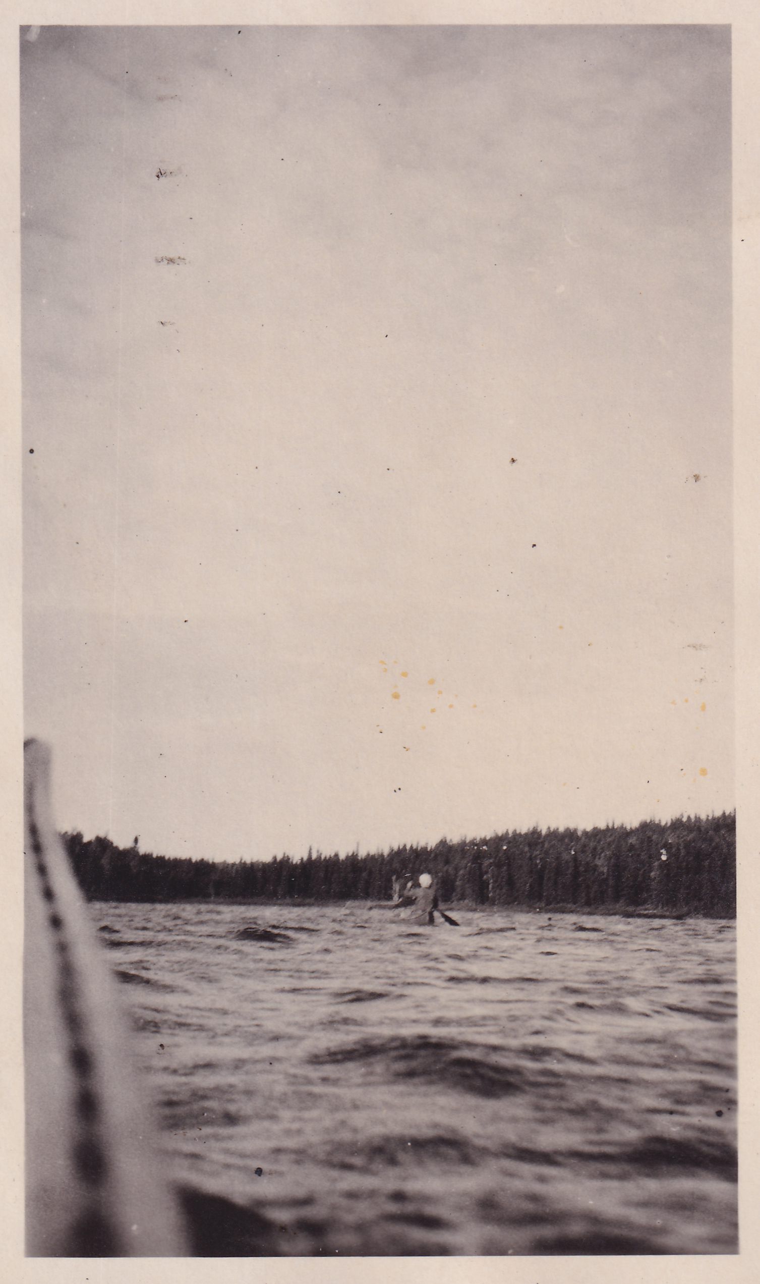Black-and-White photograph of a person paddling a boat across a body of water. The photograph was taken from another boat, and the edge of the boat is visible in the foreground.