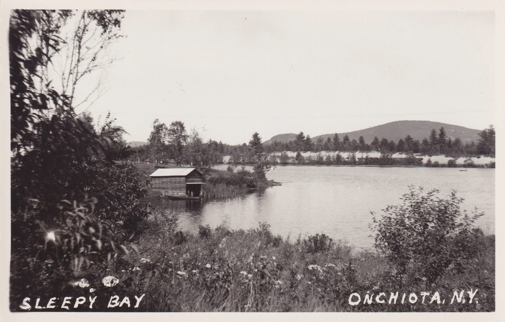 Black-and-White photograph postcard of a boathouse on a bay. Printed caption on front reads, "Sleepy Bay, Onchiota, N.Y." No photographer's mark. Unused, divided back, white border.Subject Place