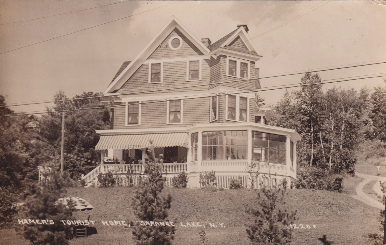 Black-and-white photograph postcard showing a large house up on a hill. Printed caption on front reads, "Hamer's Tourist Home, Saranac Lake, N.Y." No printer's mark. Unused, divided back.Subject Place