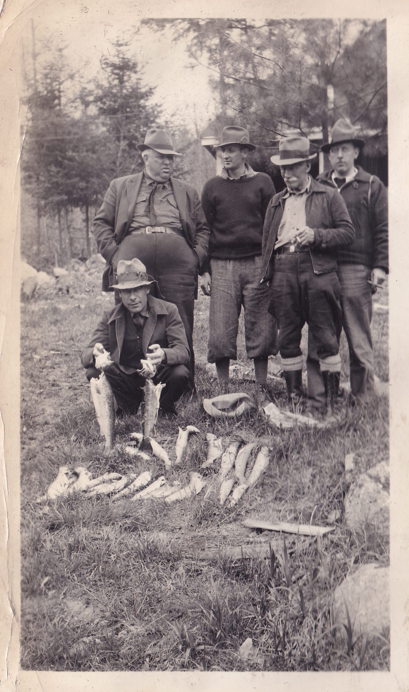 Black-and-white photograph of six men with salmon and brook trout laid out in front of them. Ray Burmaster is standing at left. Handwritten on page is, "Fishing trip at Maine May 1937. Land locked salmon and brook trout three days fishing for six men. W. Whitman - R. Burmaster - Swinyer - L. Smith - Jameson. Pictures by Dr. Haskins."