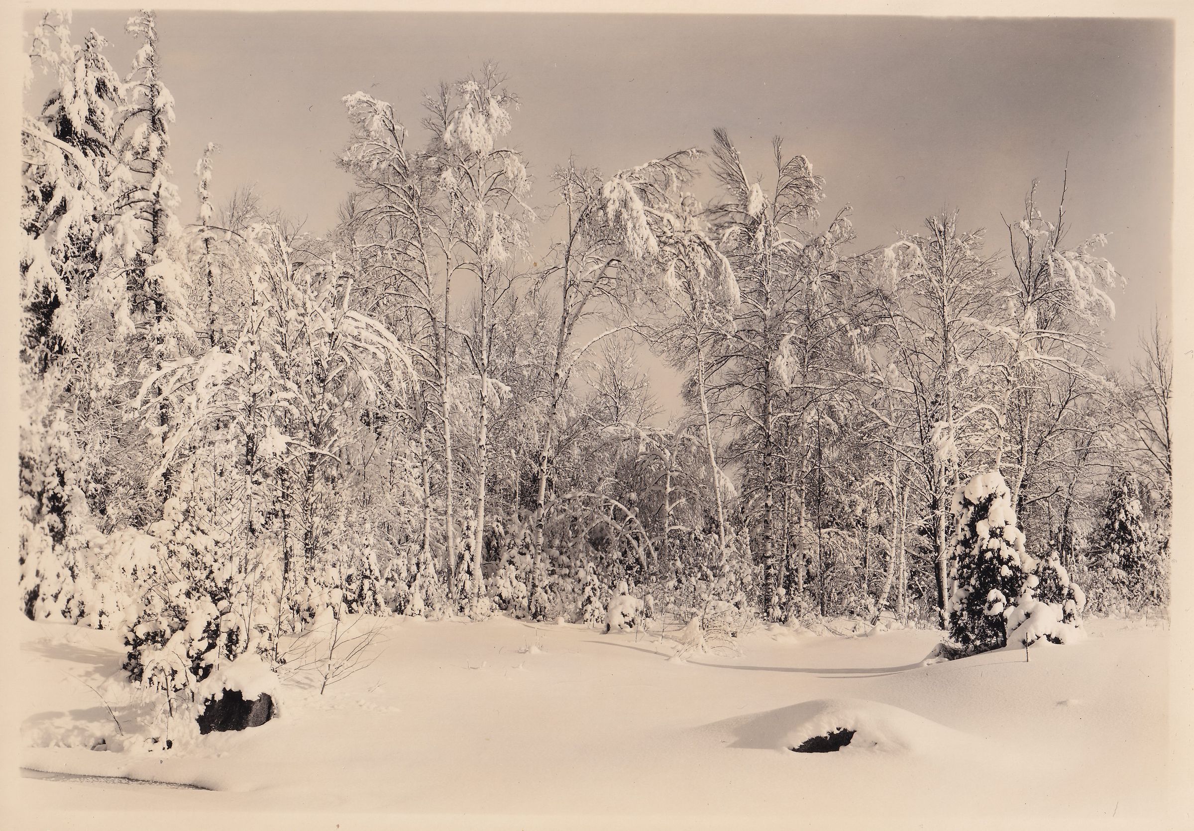 Photograph of snow-covered trees. Was part of an album of photographs given to Richard Kegel when he left the staff of the New York State Hospital for Incipient Truberculosis at Ray Brook, AKA Ray Brook Sanatorium in the 1940s.