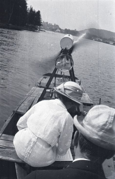 Negative taken on a small wooden boat, looking at a tall propeller attached to the back, which is running. There are two people sitting on the boat in front of the photographer, one man and one woman. Most likely taken by Mary Ives Baldwin. This item is not fully cataloged but has been uploaded so the image is publicly available; if you would like us to prioritize cataloging this item, please contact the HSL Collections team.